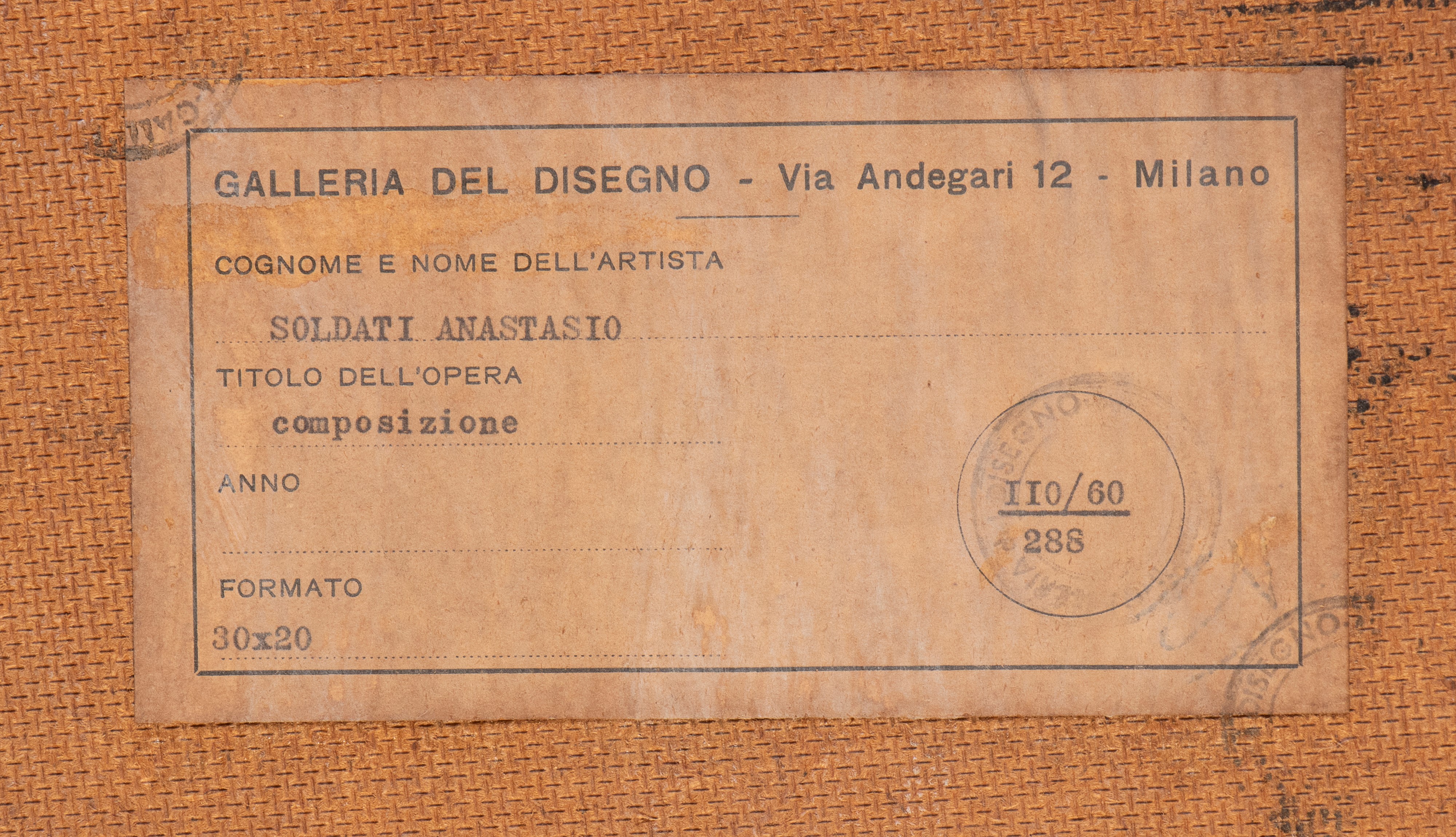 Signed lower right: A. T. On the back, label from Galleria del Disegno in Milan