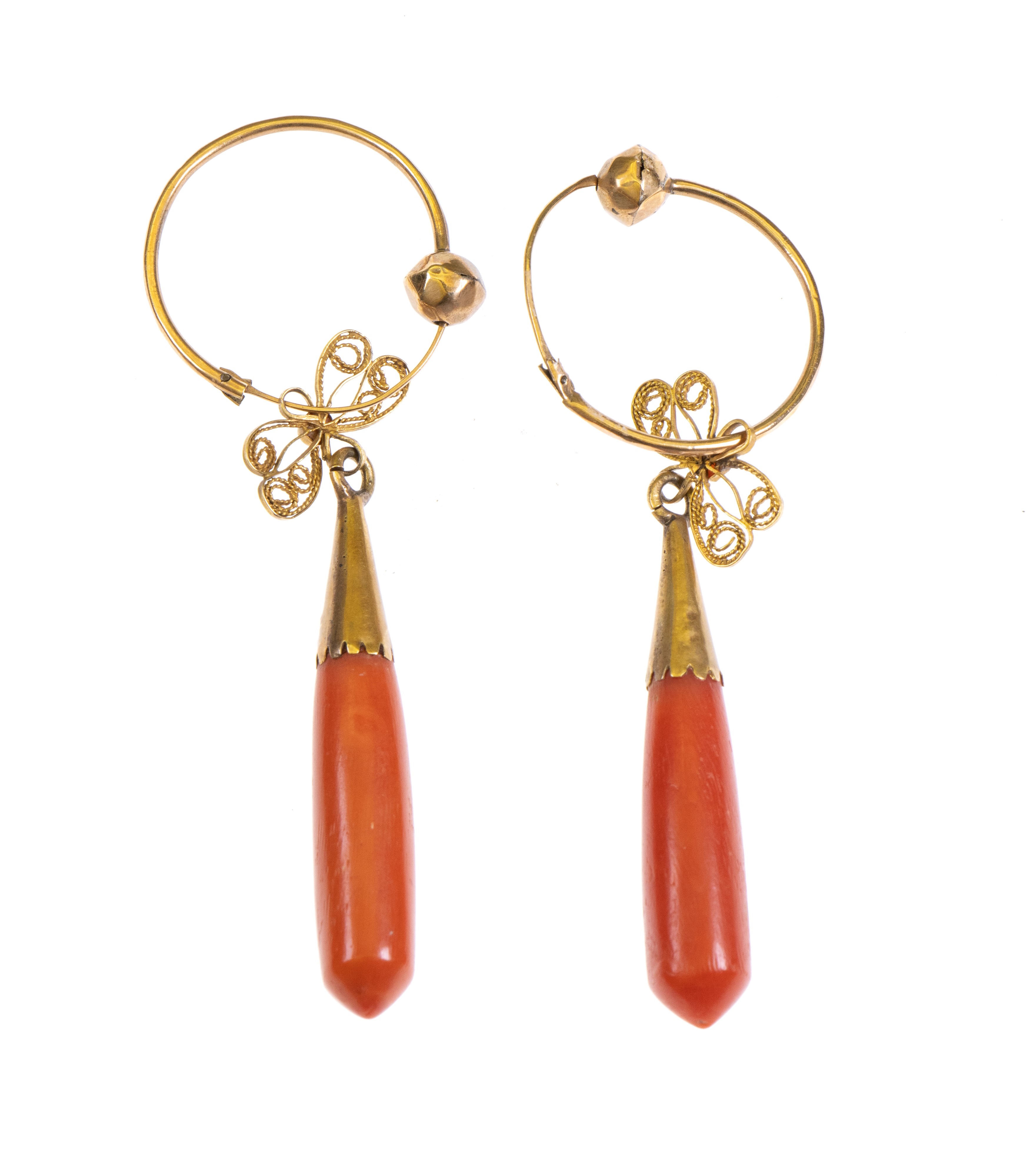 Decorative hoop earrings adorned with two pendants of Mediterranean red coral (Corallium rubrum) and bow-shaped filigree. This style of earring was characteristic of the Campidano region of Sardinia.