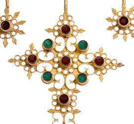18k Gold Sardinian model brooch, bow shaped, with pendant floreal elements and a central Latin cross, open worked and with small filigree decorative elements, decorated with green and red glass pastes.