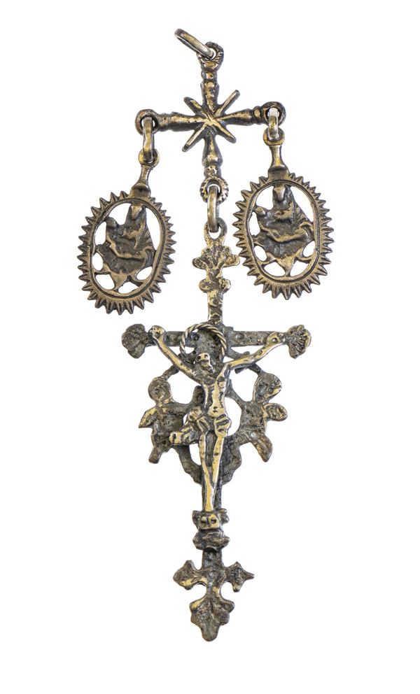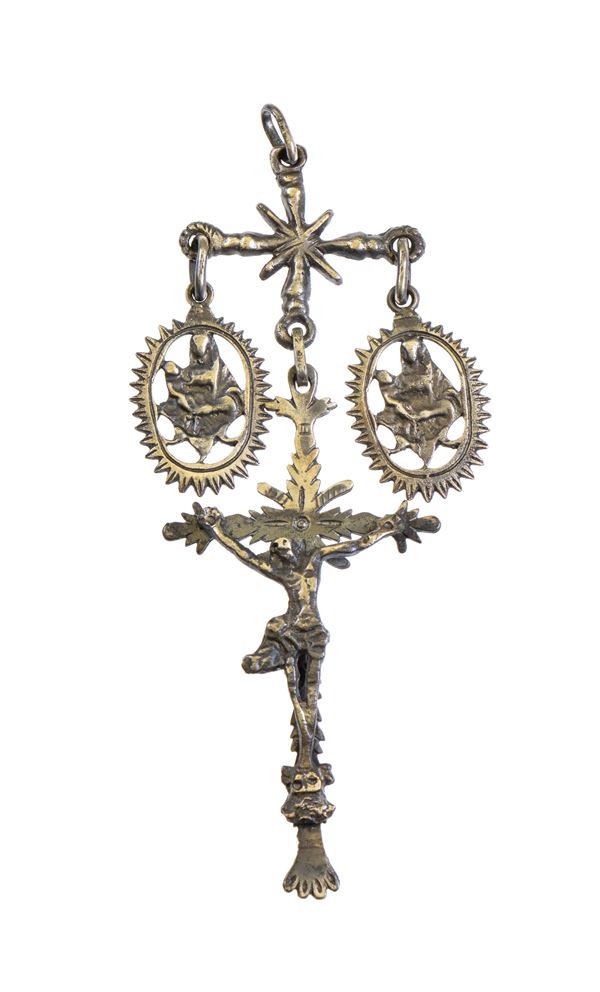 All four crosses feature additional decorations. The first cross bears, above the horizontal arm, a double-pendant element with two pierced oval medallions, each with a stylized figure at the center. The second and fourth crosses are flanked by two pairs of cherubs and both display a double-pendant element with two oval medallions depicting the Pietà, with the Virgin holding Christ in her arms. The third cross, however, lacks these pendant elements, probably lost over time, but it mirrors the same depiction as the second and fourth crosses, with two cherubs placed on the right and left.
