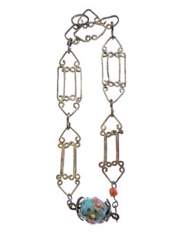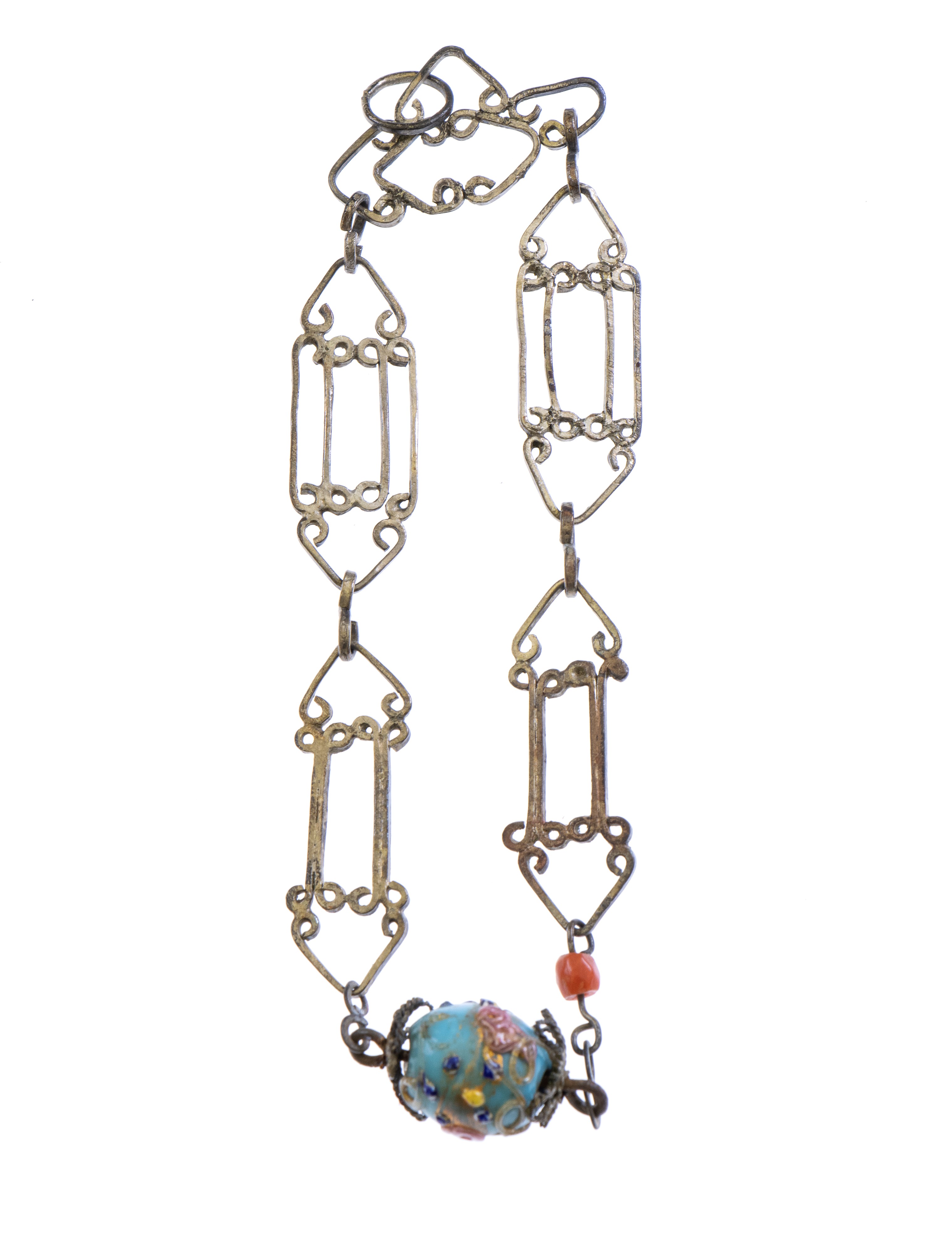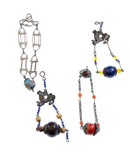 Comprising of 4 solid silver pendants used as talisman against the evil eye, decorated with polychrome wooden inlays and small beads of glass paste.