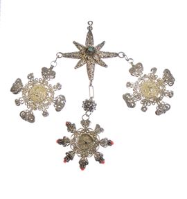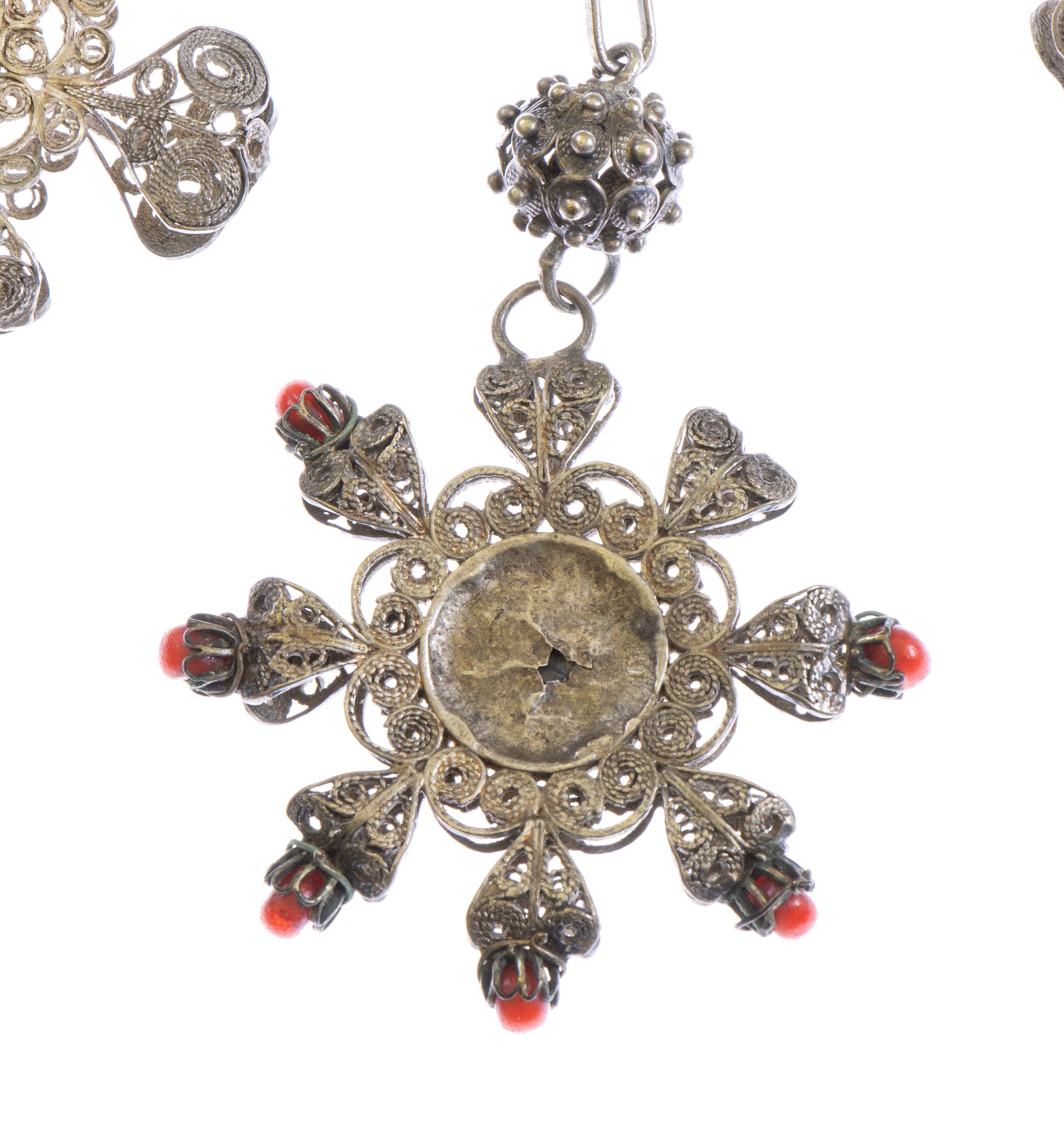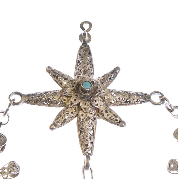 Worked in filigree and openwork, the object was made as a prize or medal of recognition, as evidenced by the use of silver and the details in coral and turquoise. Its star shape, with multiple points, symbolizes the honor, each point representing a value or virtue.