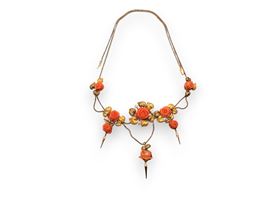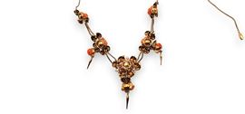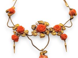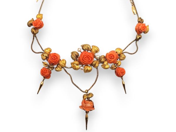 yellow gold with a line and fringe of Cerasuolo coral carved flowers (Corallium Elatius) and small freshwater pearls.