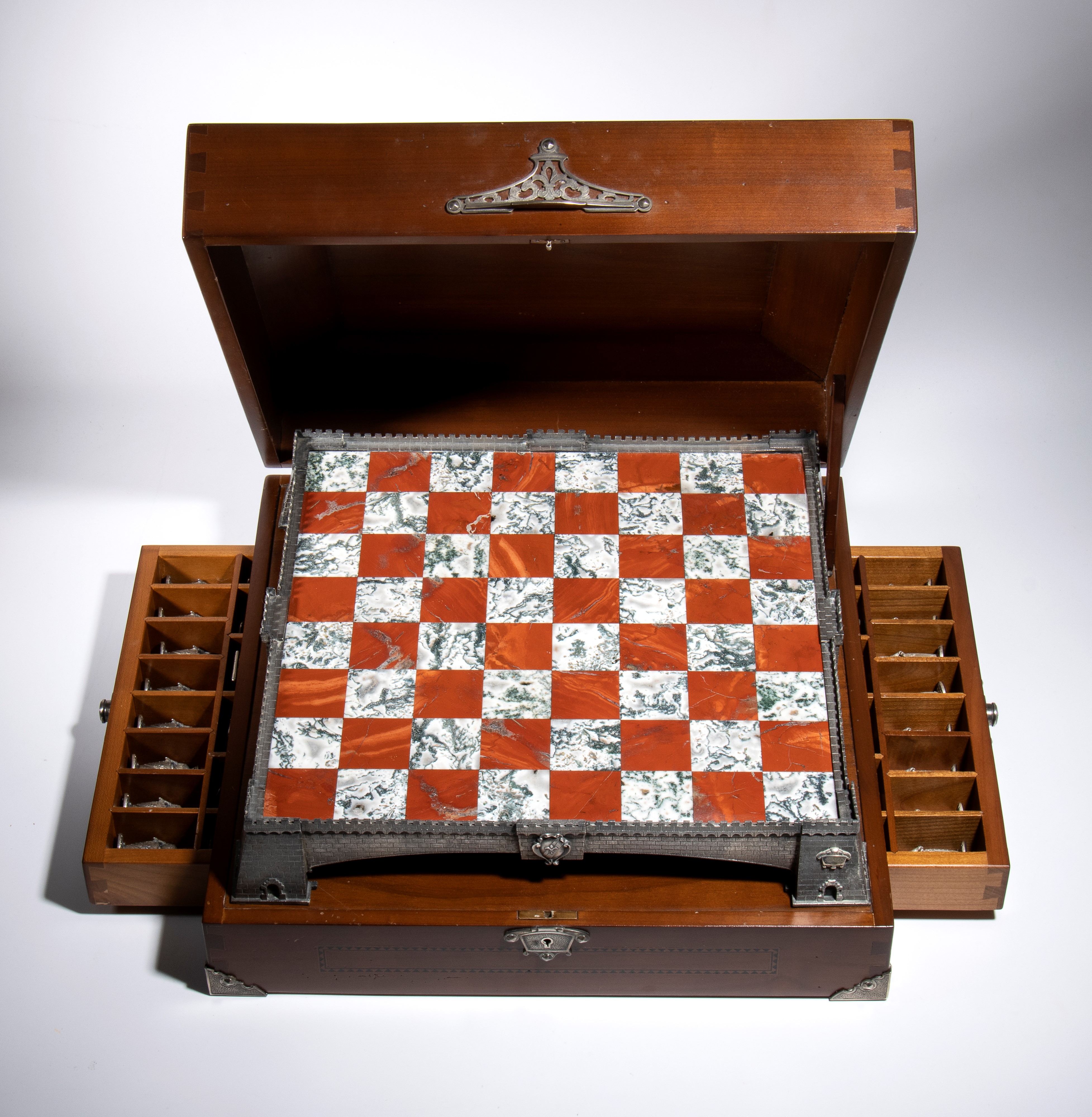 The squares of the chessboard are made of red jasper and moss agate, stones selected for their vivid color contrast, echoing the hues of the marble in Marostica’s historic square.