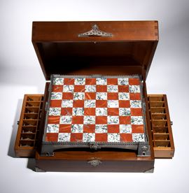 The bases of the chess pieces derive from models designed by sculptor Federico Monti (1836–1910) and are executed in sterling silver.