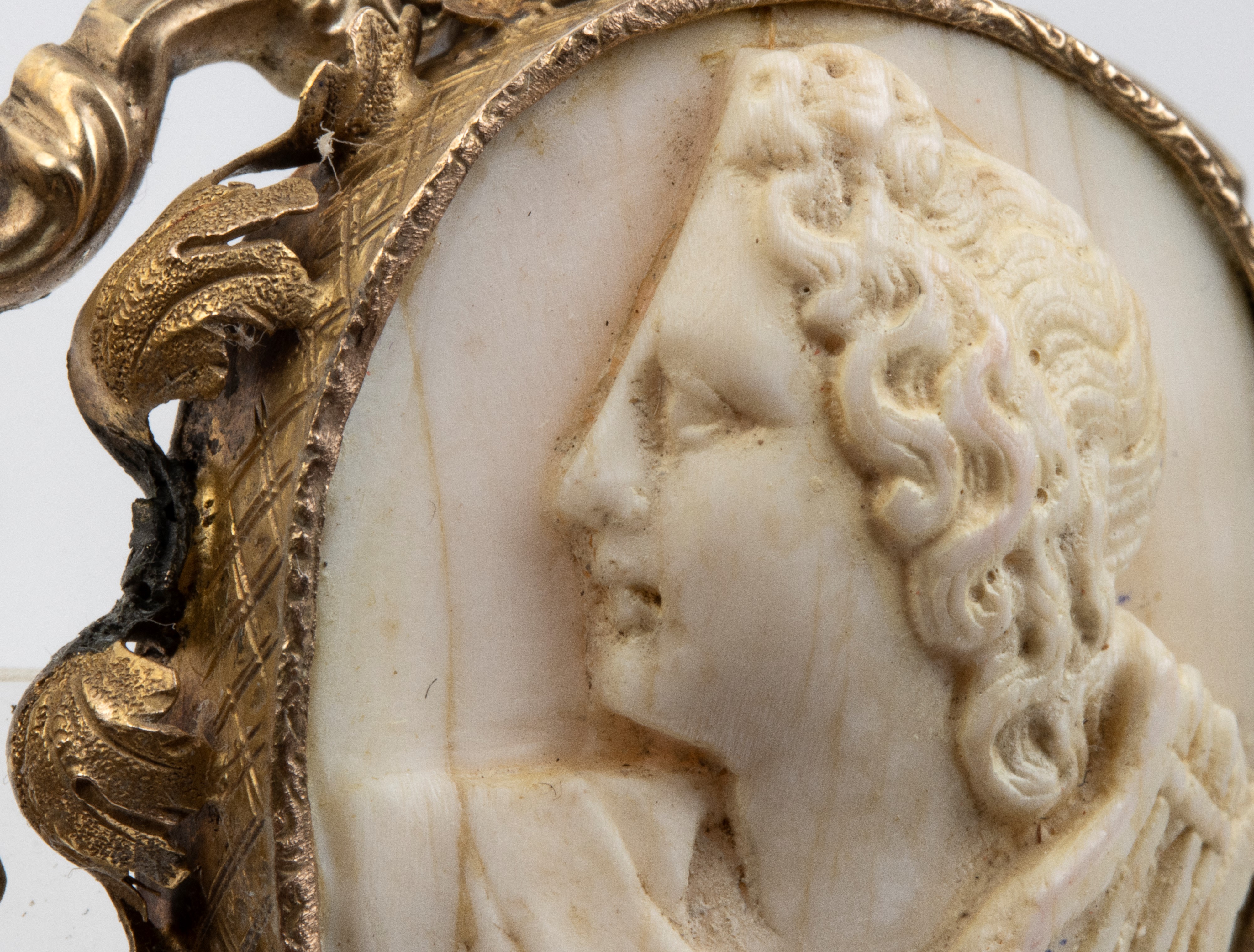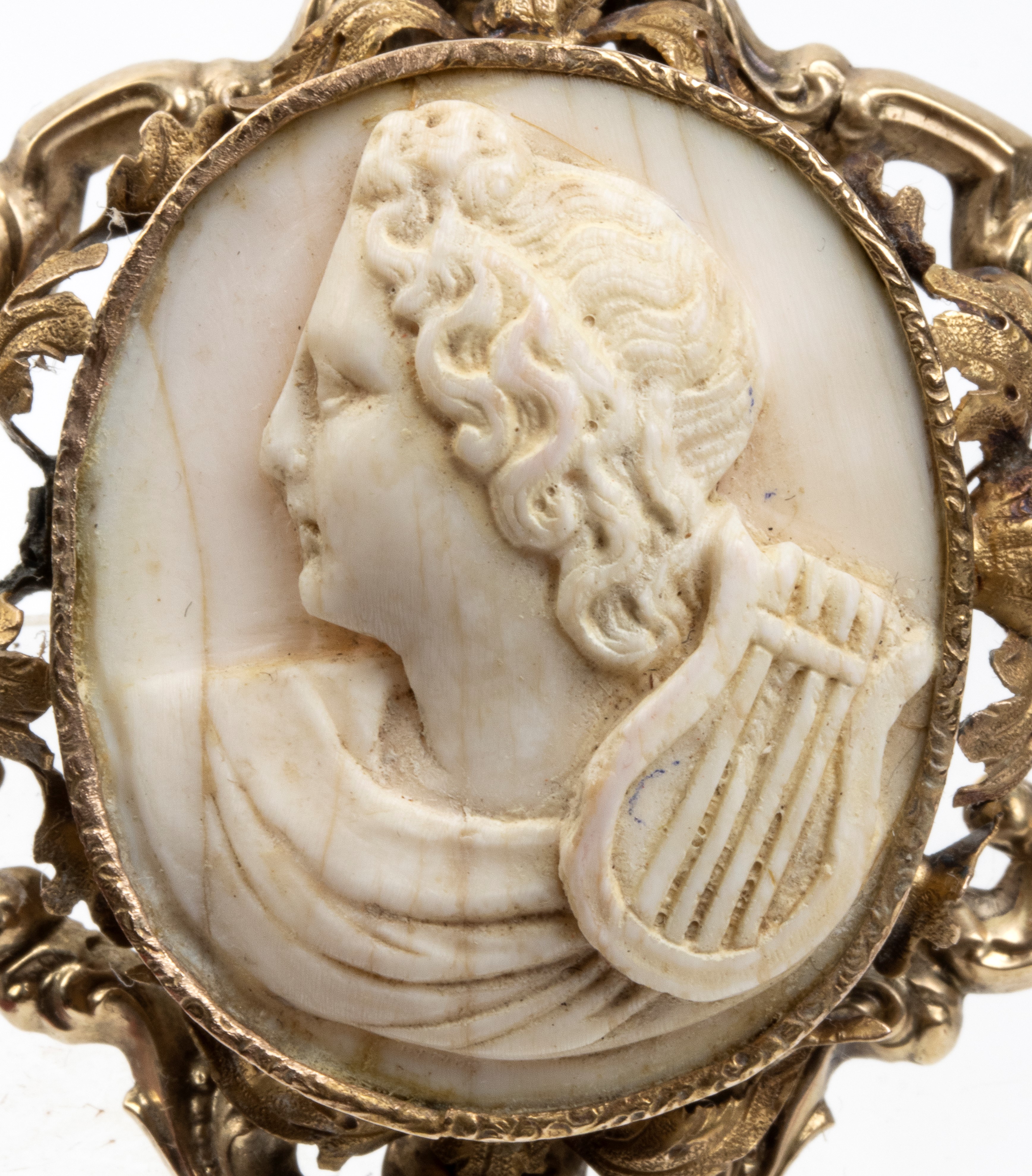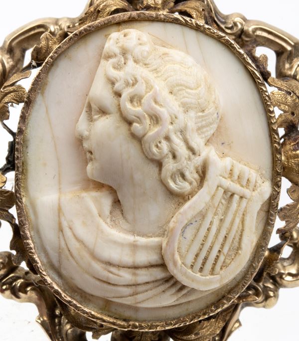 yellow gold frame, set with a carved shell cameo, depicting a classical-style bust of a woman with a lyre.
