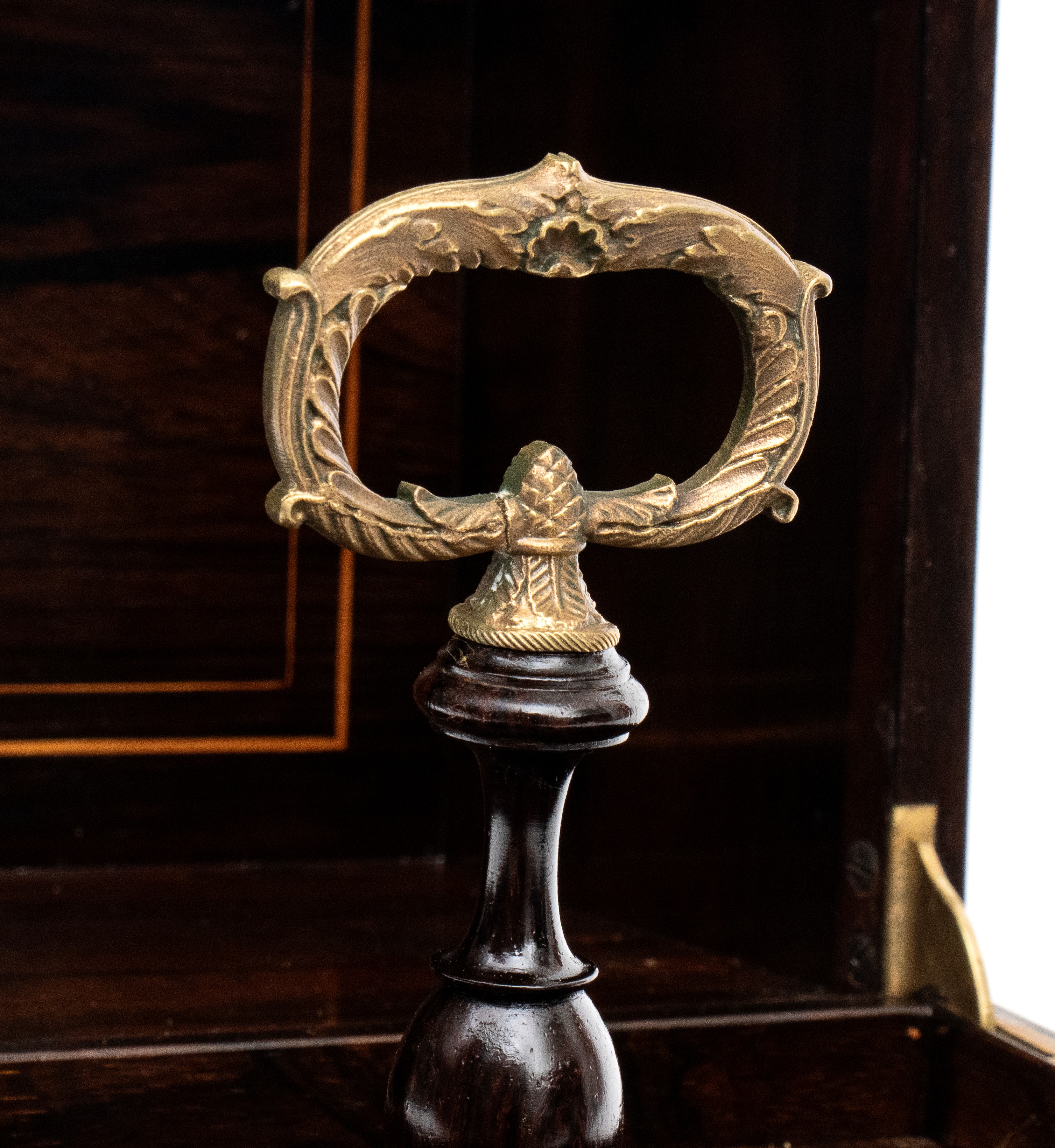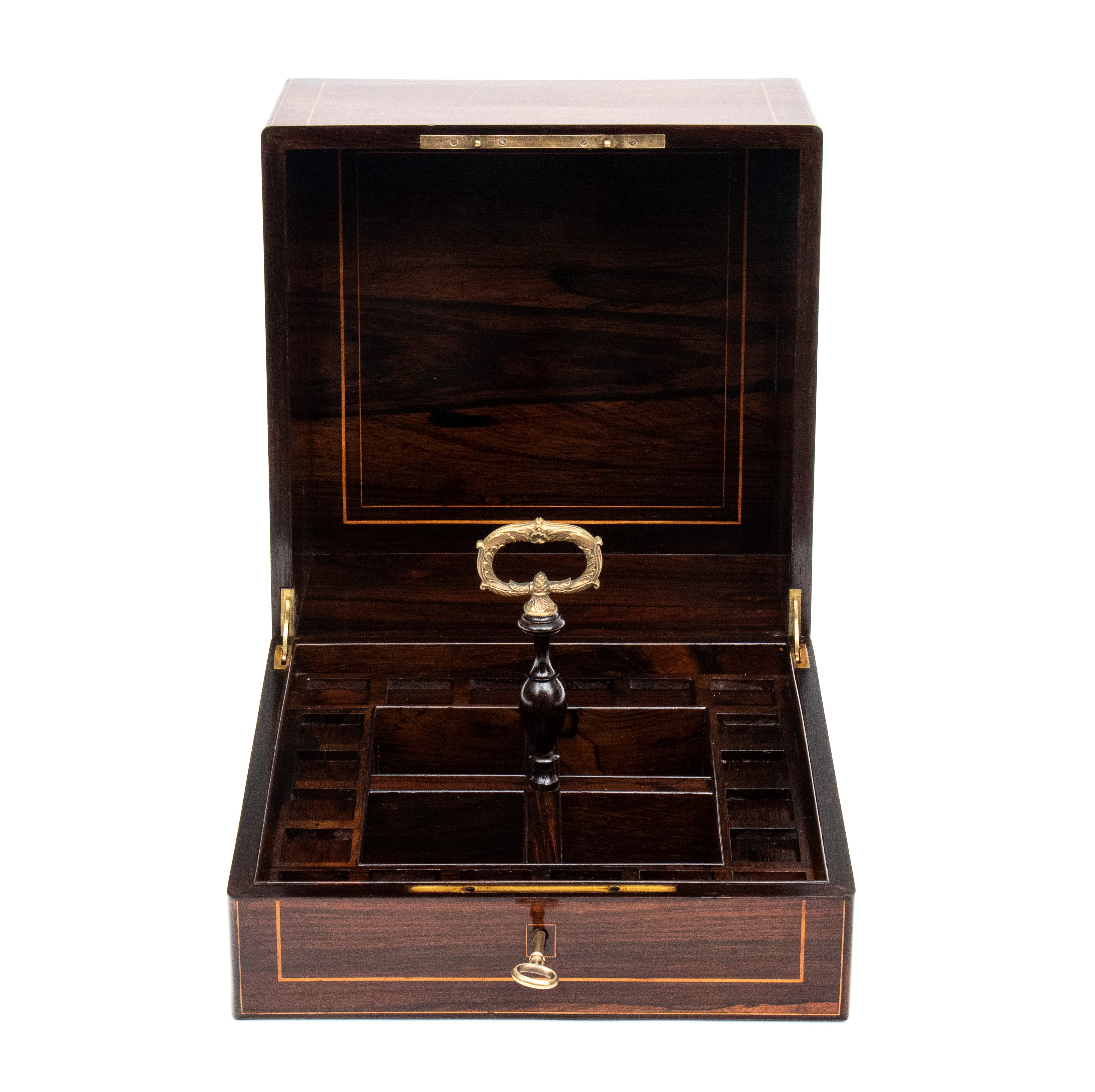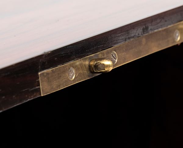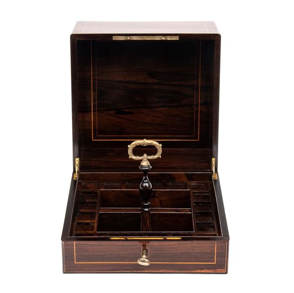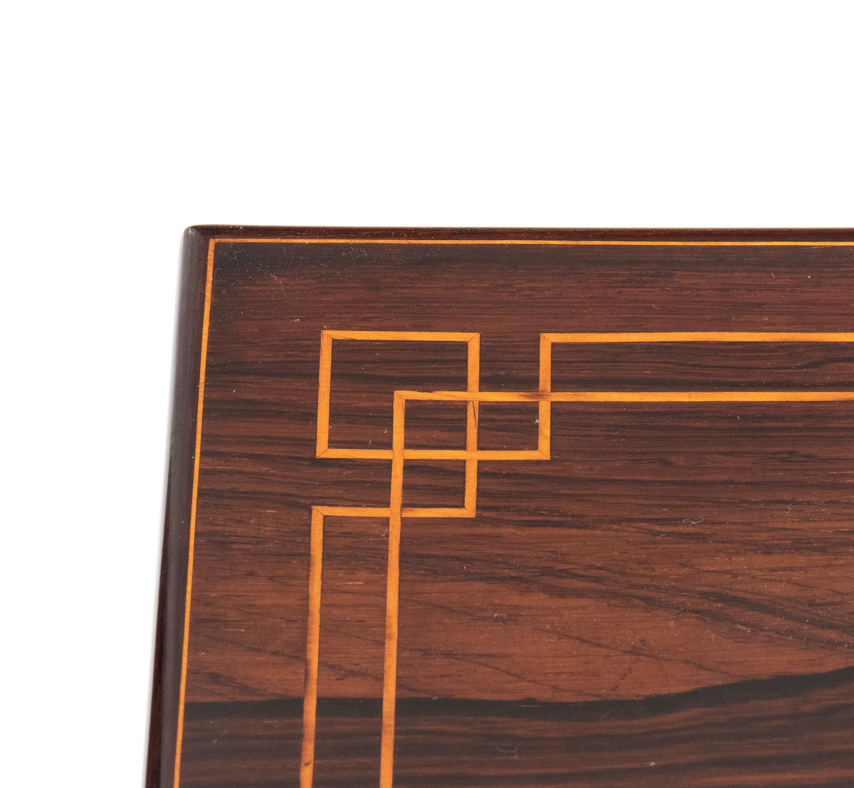 in rosewood (Dalbergia spp.) and inlaid with geometric shapes in boxwood. Concealed brass handles on the sides. Interior free of bottles and glasses.
