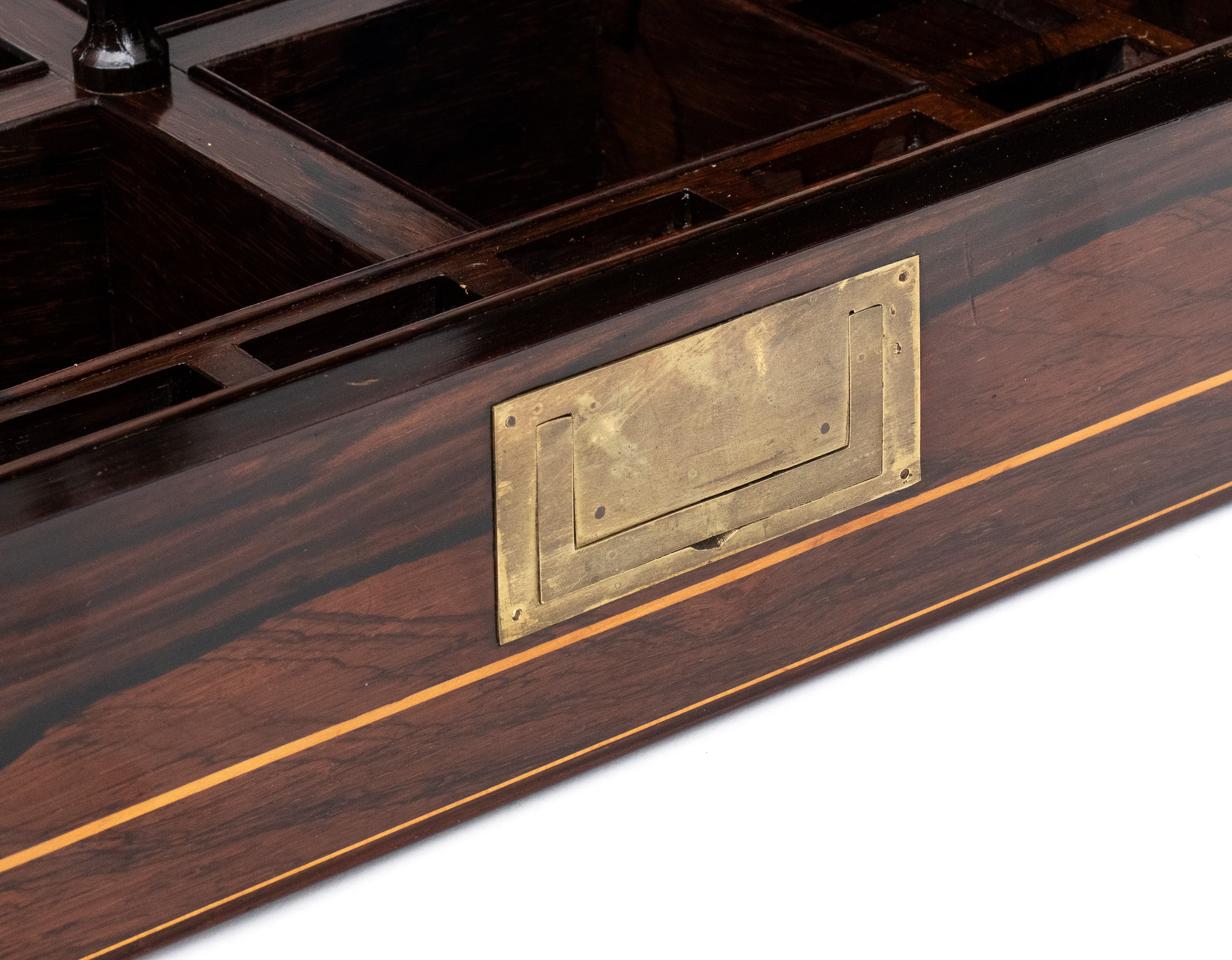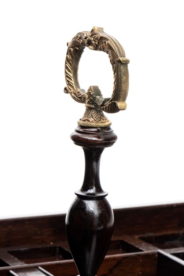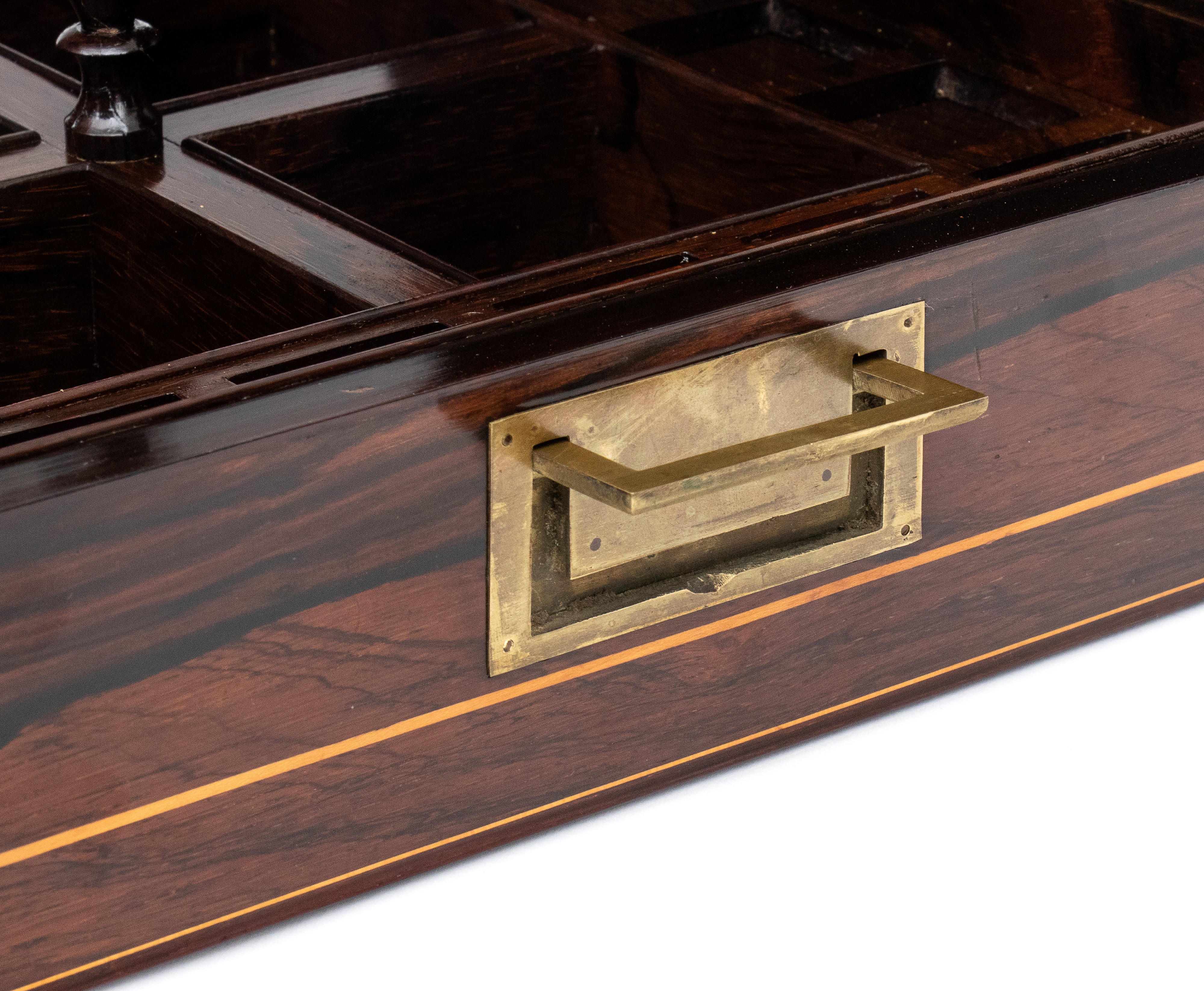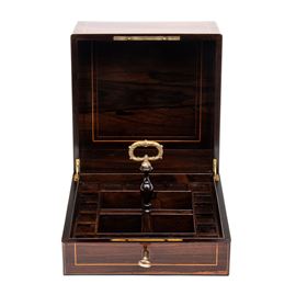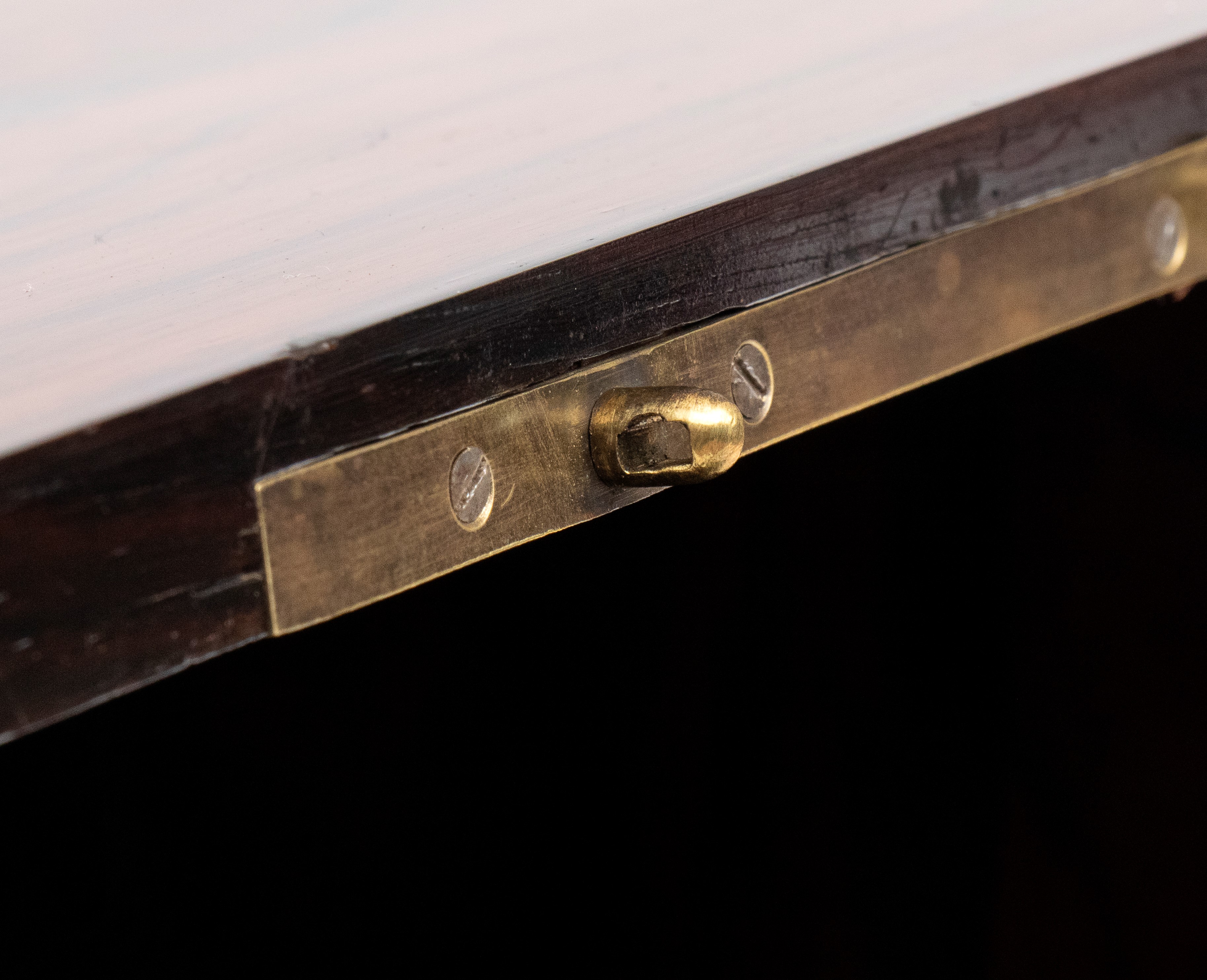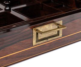 in rosewood (Dalbergia spp.) and inlaid with geometric shapes in boxwood. Concealed brass handles on the sides. Interior free of bottles and glasses.