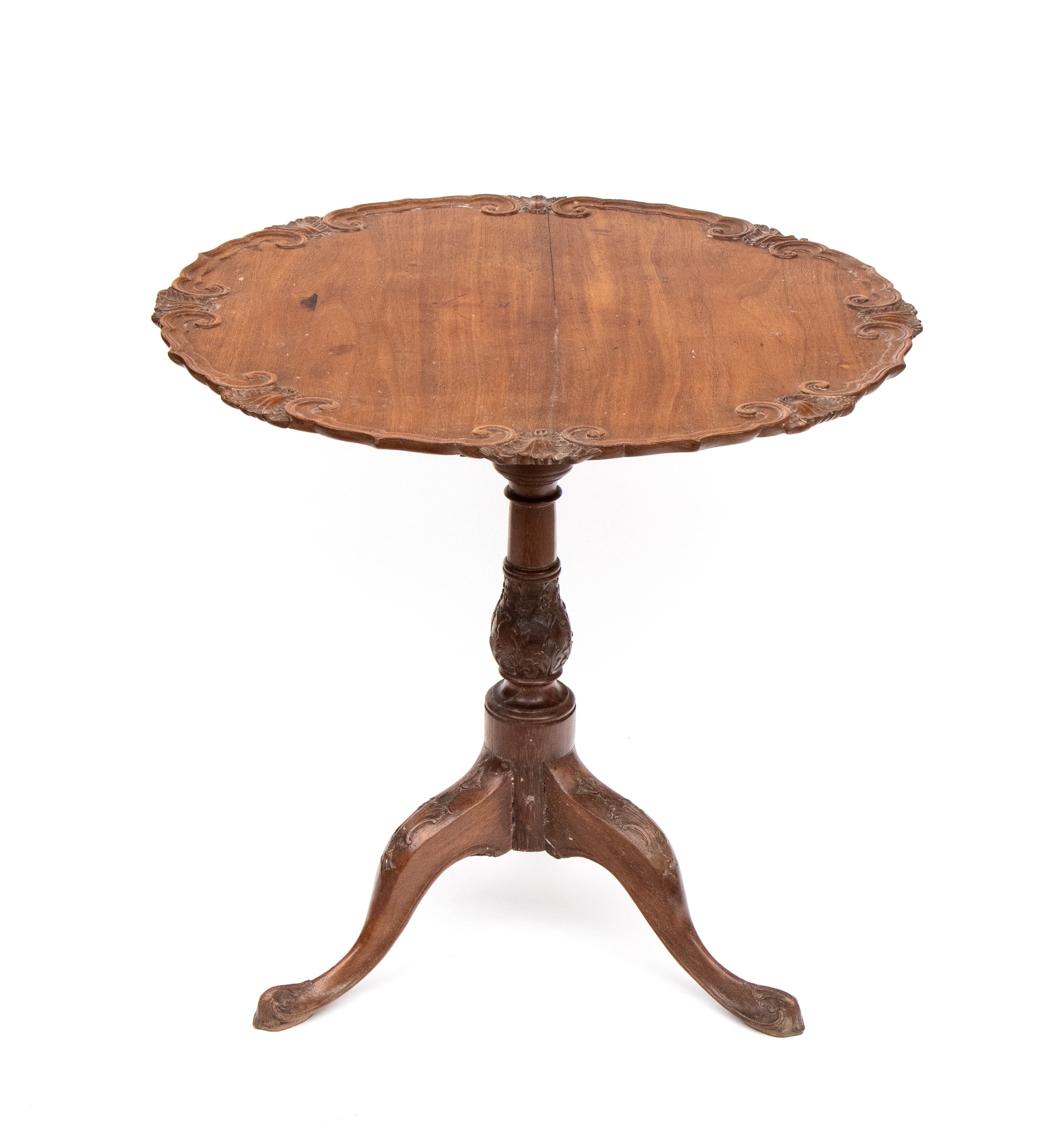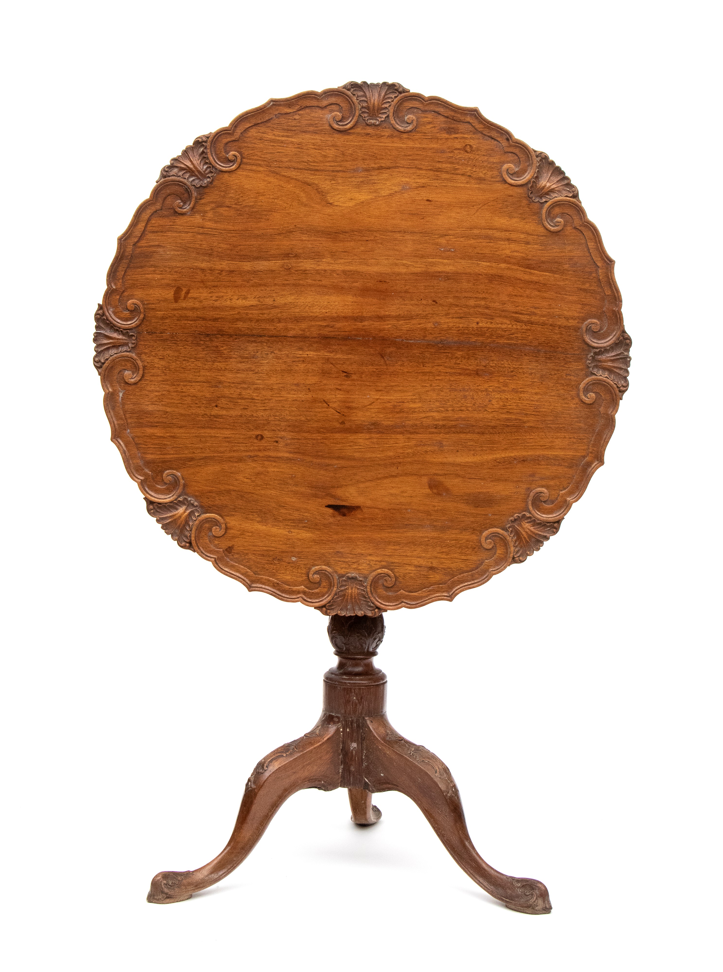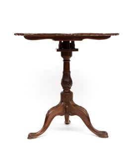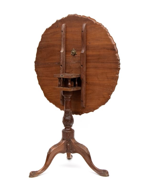 in mahogany wood, with a round folding top finely carved along the edge with scroll and shell motifs. Tripod base with arched legs and curved feet, carved with leaf decorations. Original mechanism with brass hinge and lock.