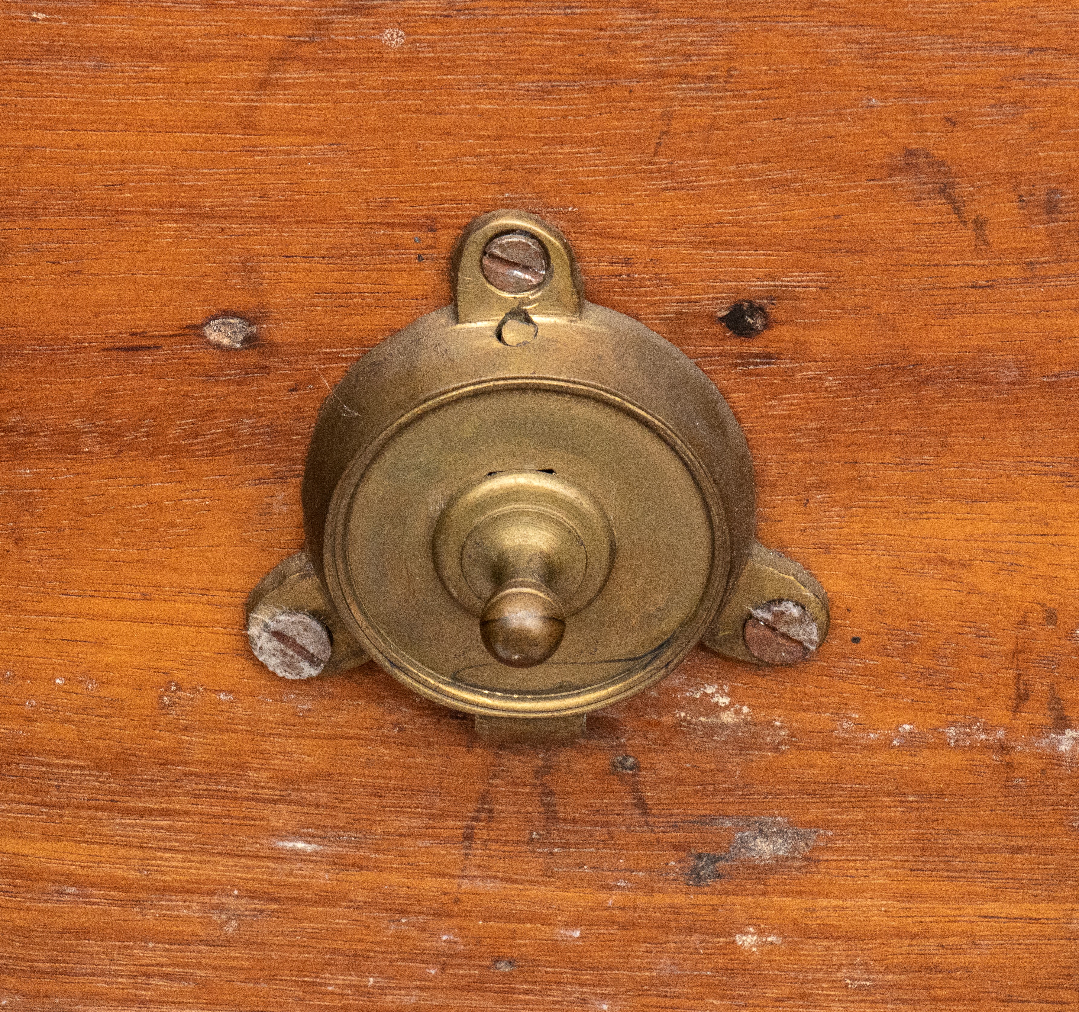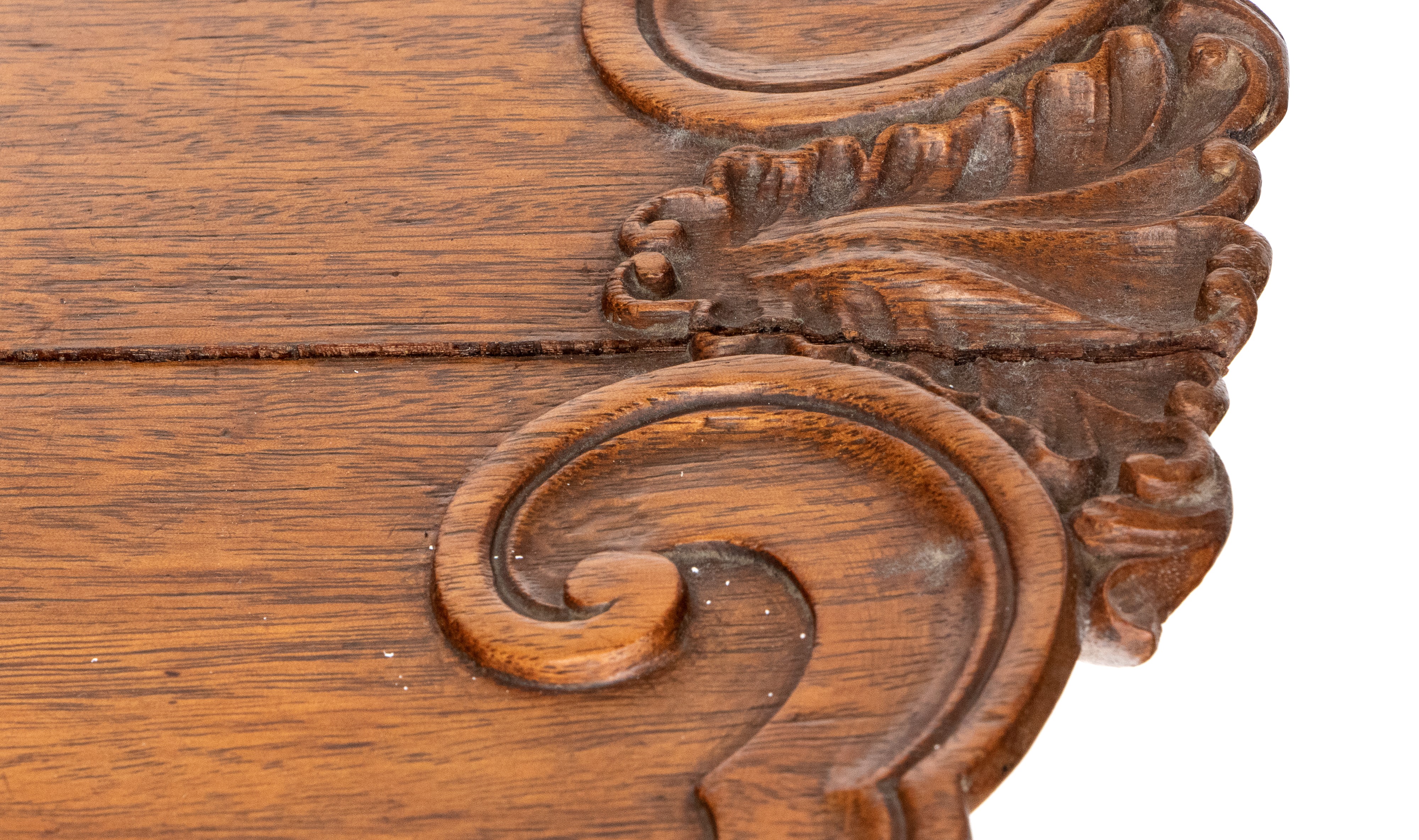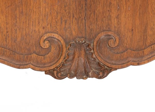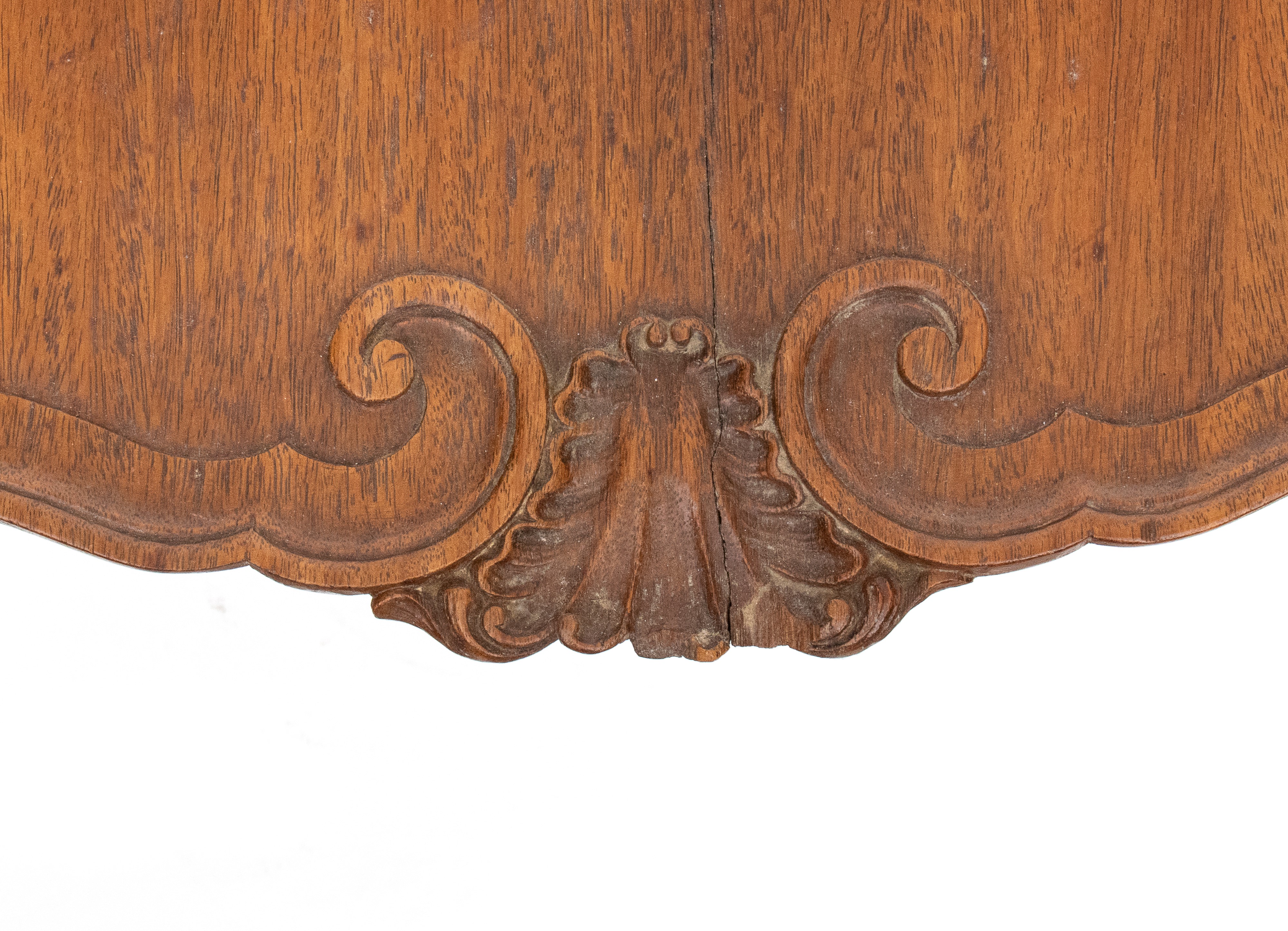 in mahogany wood, with a round folding top finely carved along the edge with scroll and shell motifs. Tripod base with arched legs and curved feet, carved with leaf decorations. Original mechanism with brass hinge and lock.