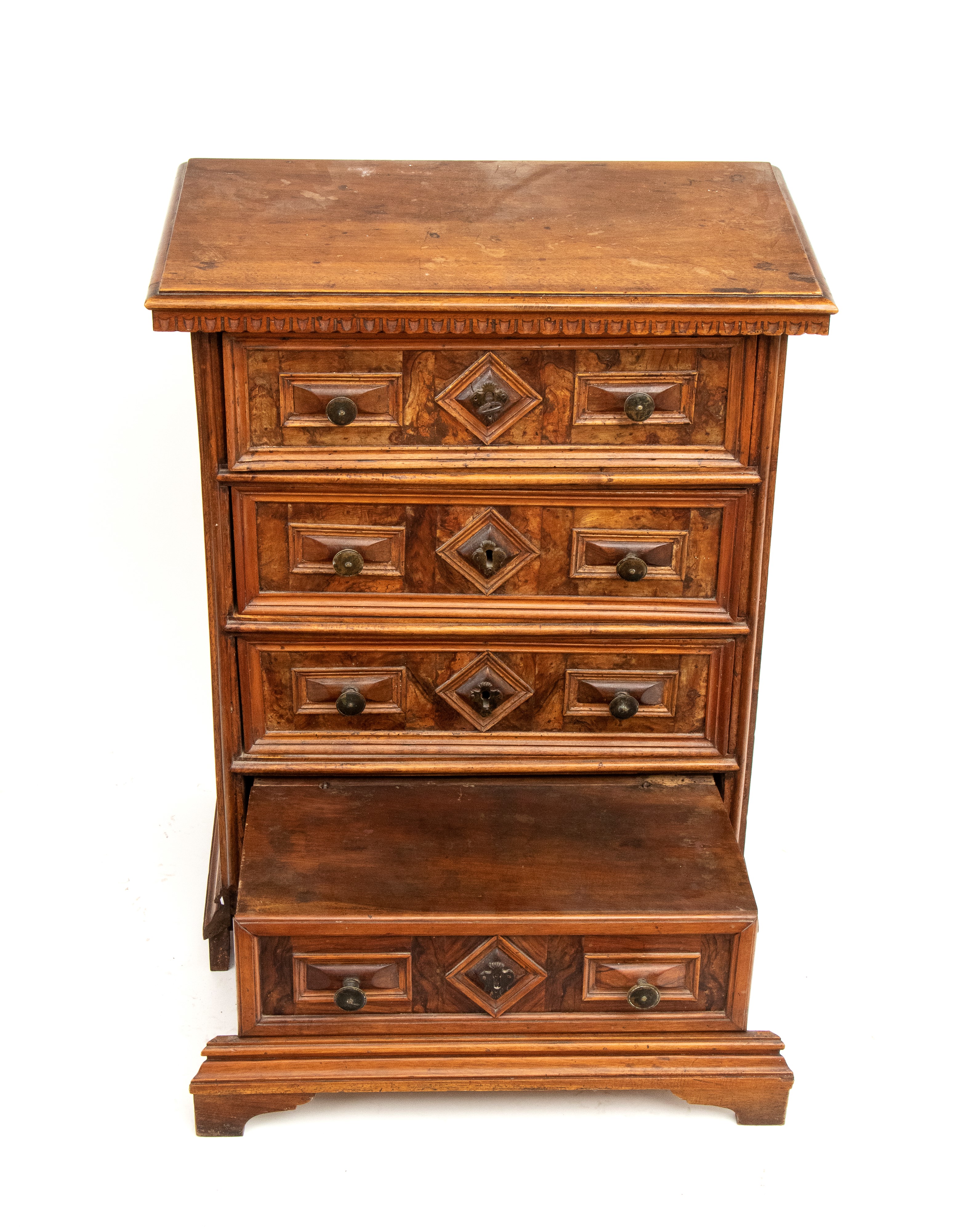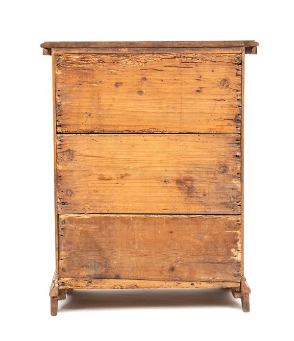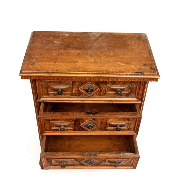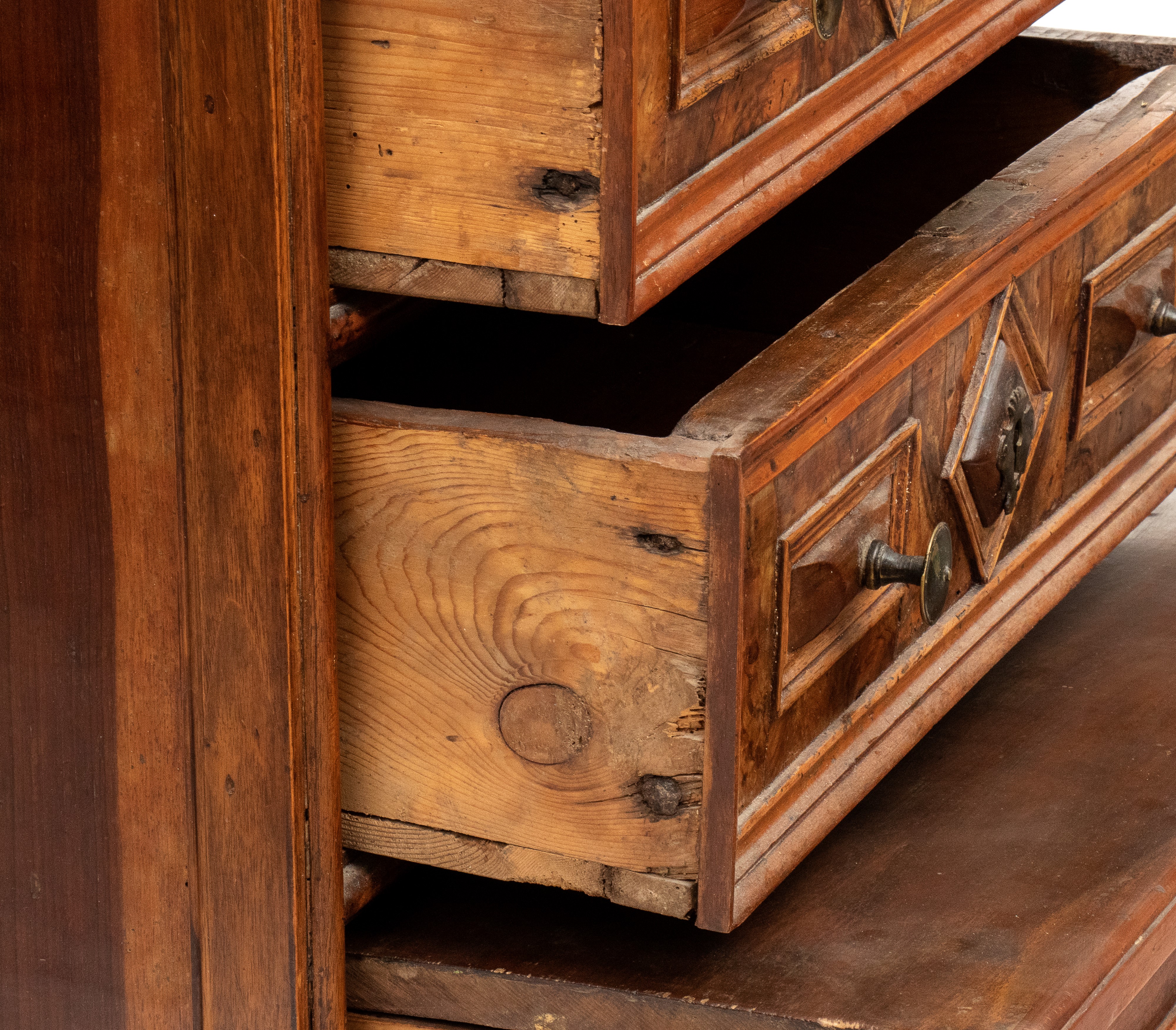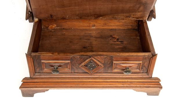 in walnut wood and burl wood, with drawers at the front and a lower flap door that conceals a kneeling platform. Decorations on the drawers feature rhomboid shapes and relief motifs.