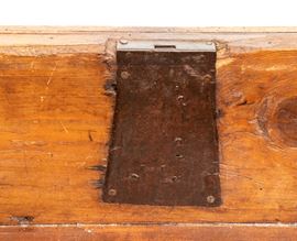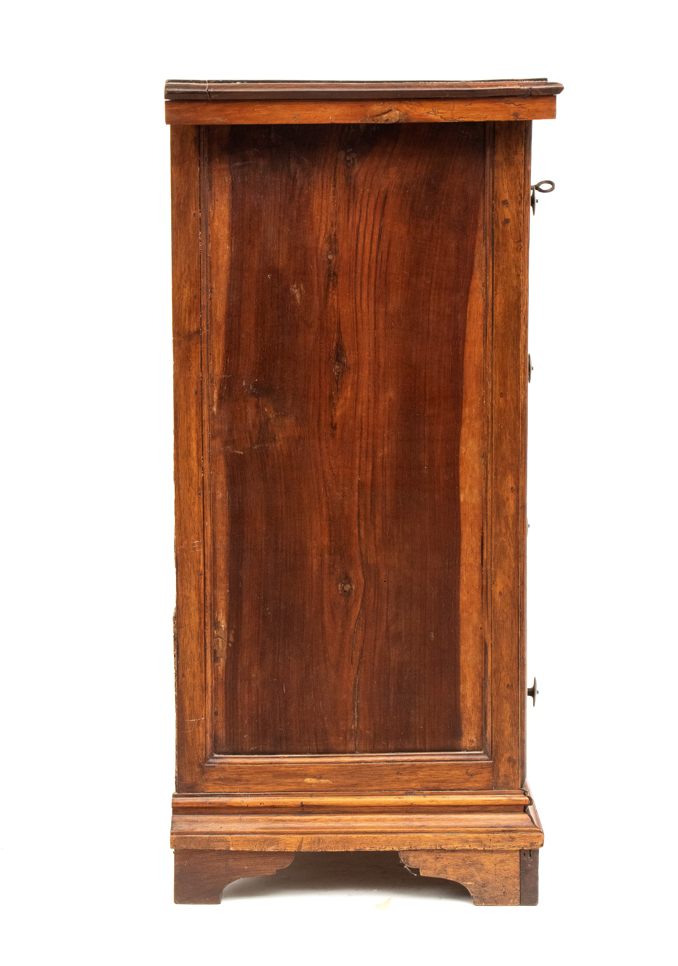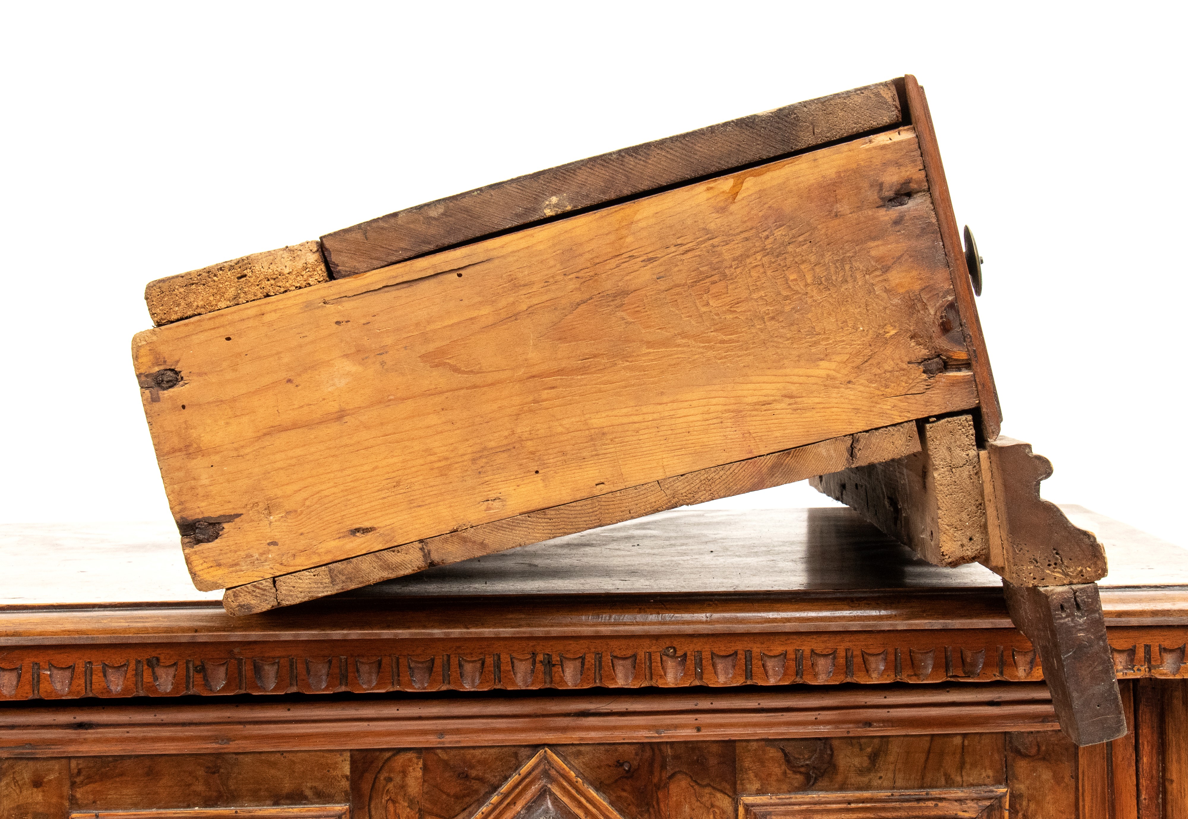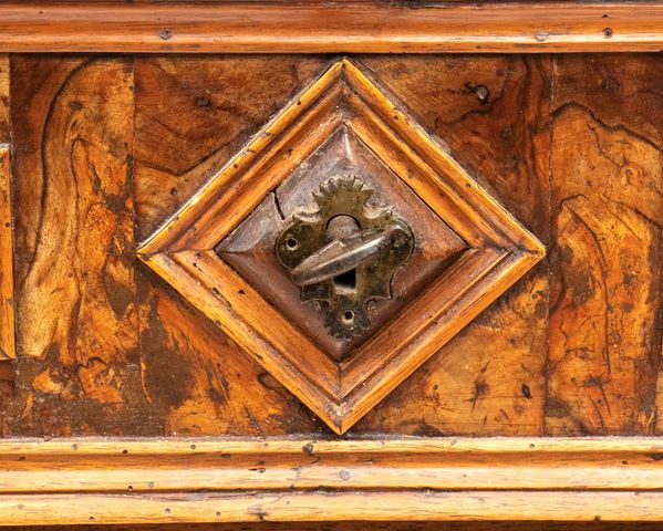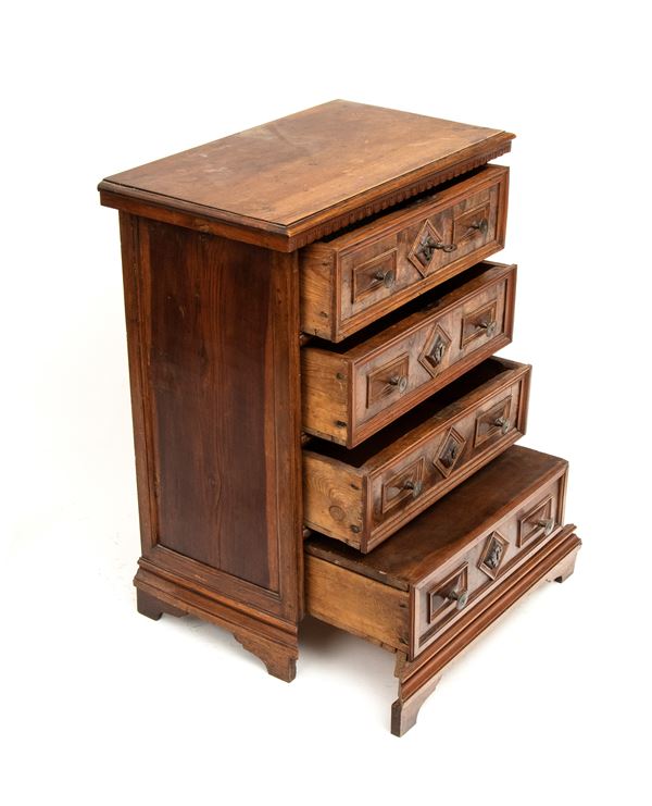 in walnut wood and burl wood, with drawers at the front and a lower flap door that conceals a kneeling platform. Decorations on the drawers feature rhomboid shapes and relief motifs.