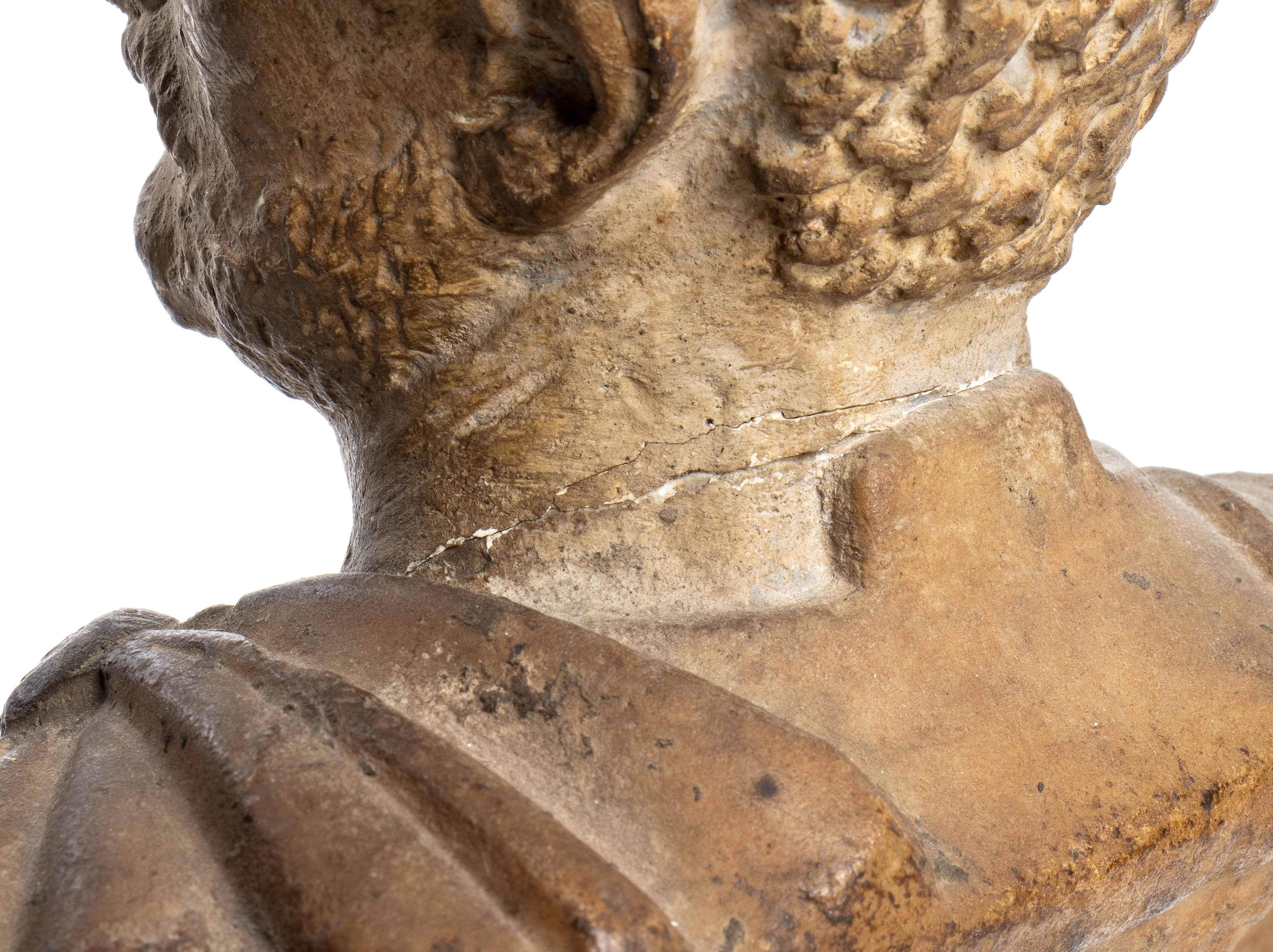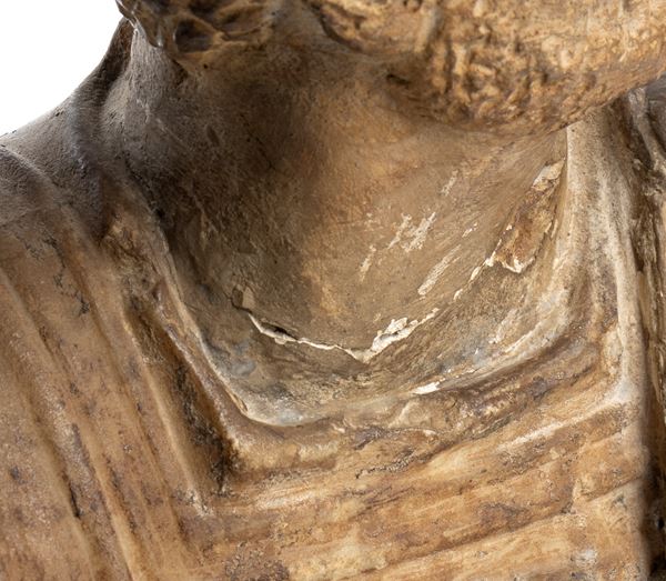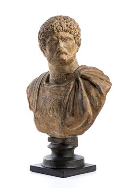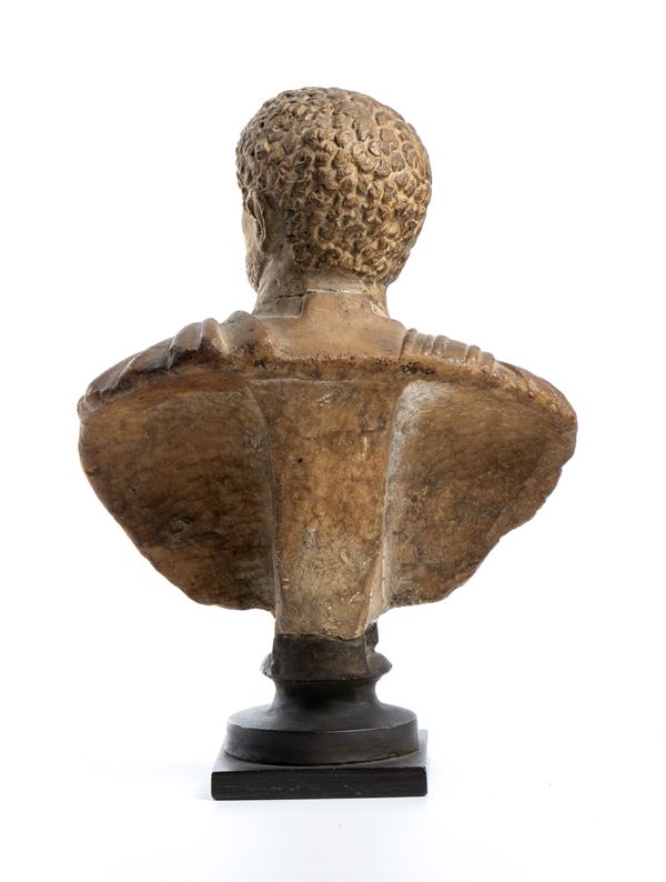 carved with careful attention to detail and drapery, evokes the classical models of imperial Roman sculpture, with armor and paludamentum. Black turned base.