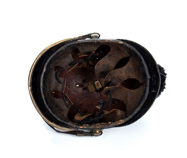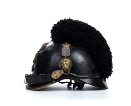 Black lacquered boiled leather cup with large crowned monogram, cockade and wimple; in good condition, restored.