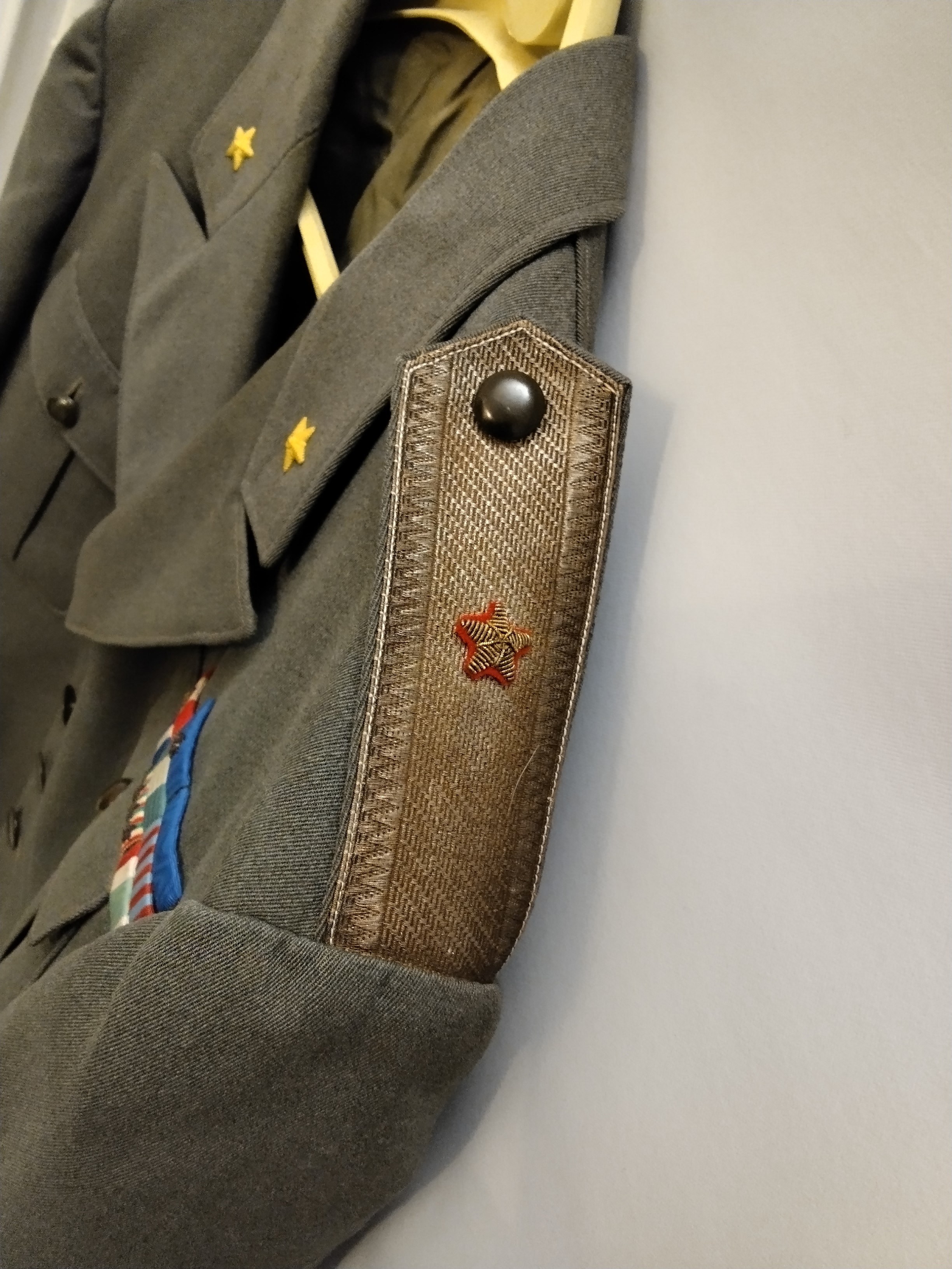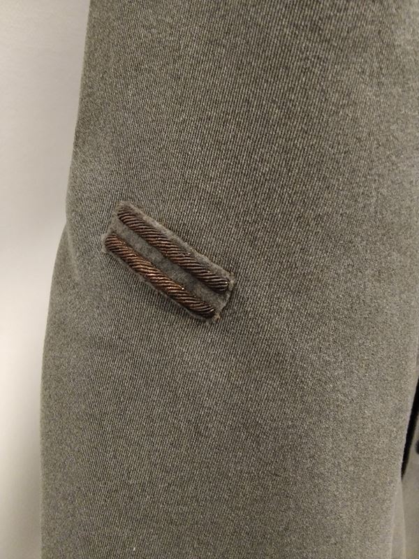 Grey cord jacket with fixed shoulder straps in silver braid and a star, model in use from 1943 to 1946, complete with campaign ribbons and war wounds on the right sleeve; in excellent condition.