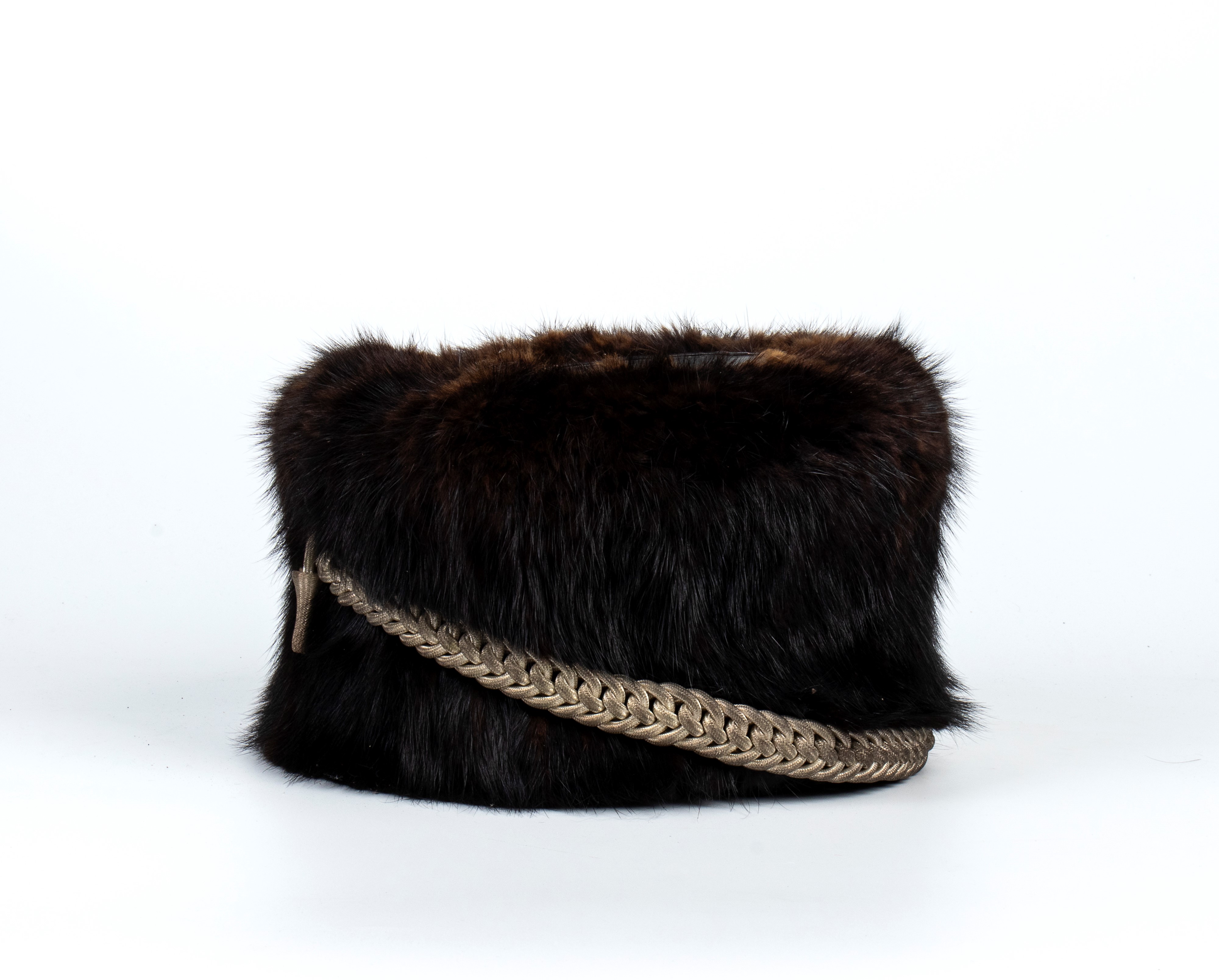 Rigid, fur-covered shaft with leather trim, silver-plated front decoration and tassel, and silver-plated tubular cords; in excellent condition, very beautiful.