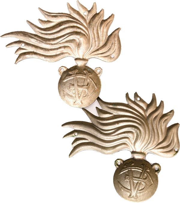 Lot of two metal insignia for the Royal Carabinieri headdress, in stamped white metal, excellent condition.
