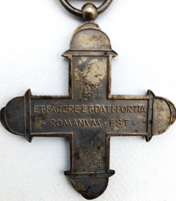 Cross in silver metal and red enamel, light oxidation on the metal, on the back without enamel with manufacturer's marks, contemporary ribbon.