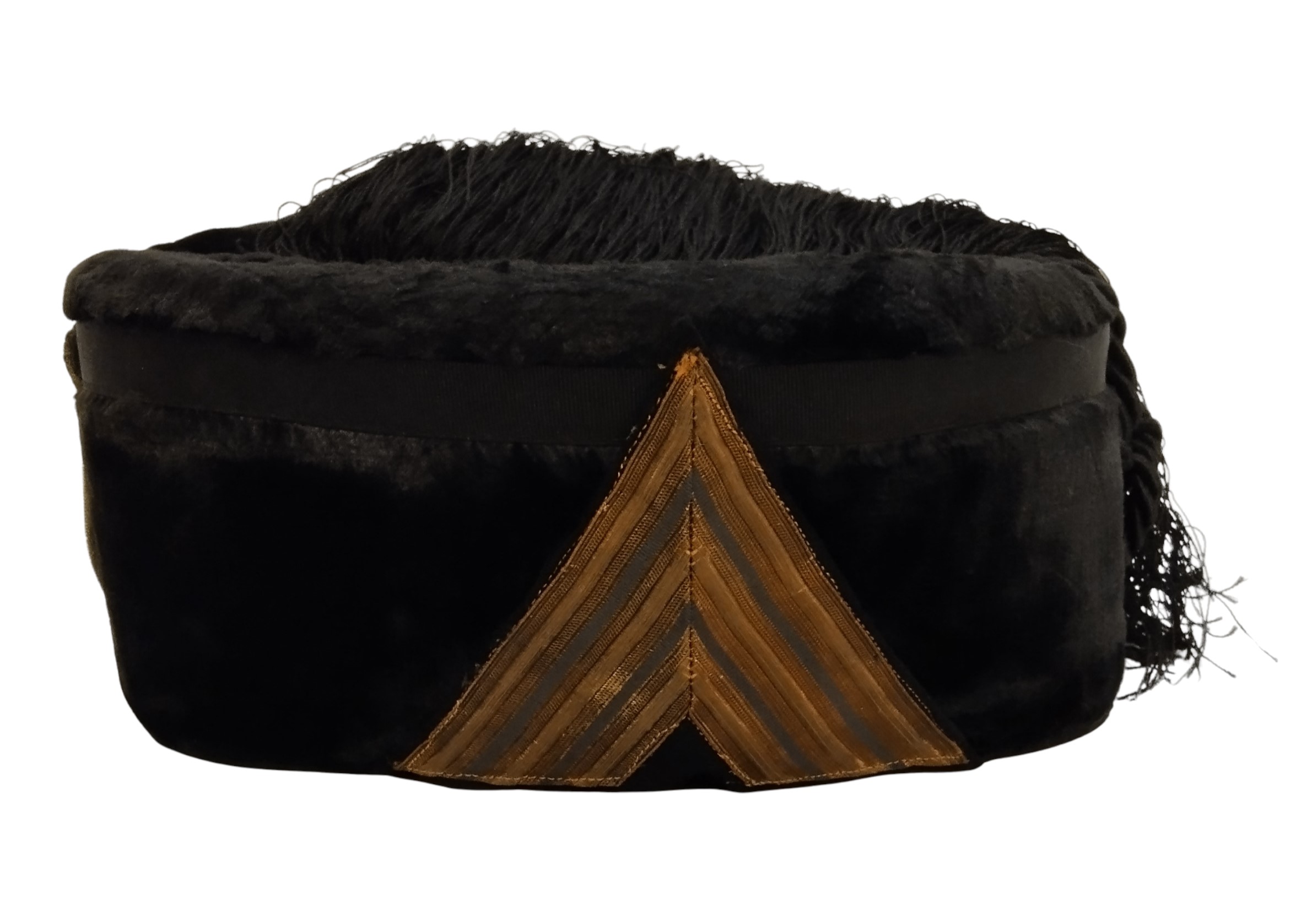Fez colbac, rigid frame covered in silk velvet, beautiful frontal weapon trophy embroidered with gold bullion, side rank, silk cord, inside lining with manufacturer's marks, in excellent condition.