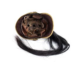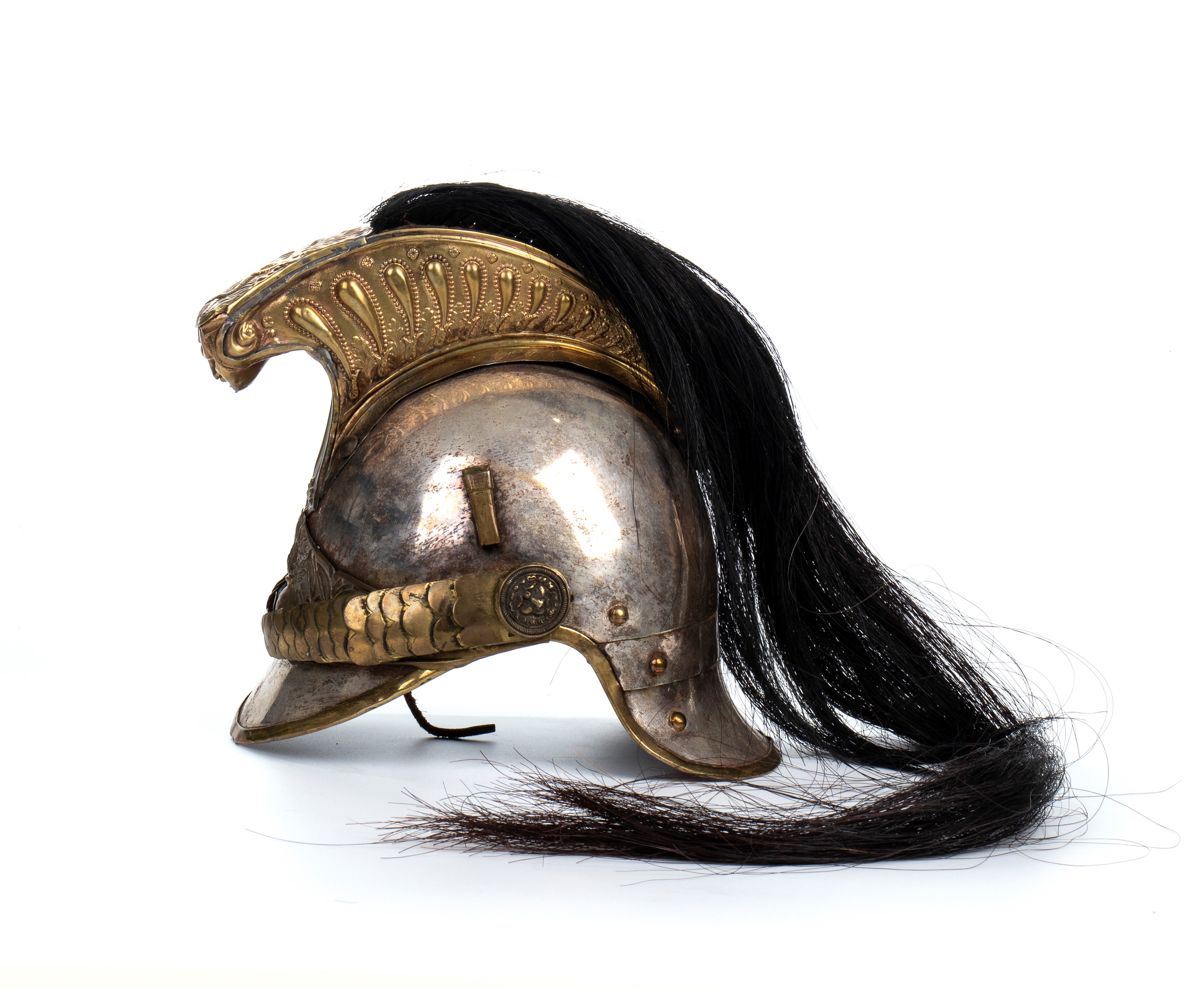 Silver-plated metal helmet with crest, scaled chinstrap and gilt metal front plate, in good general condition, with some defects due to use, very eye-catching.