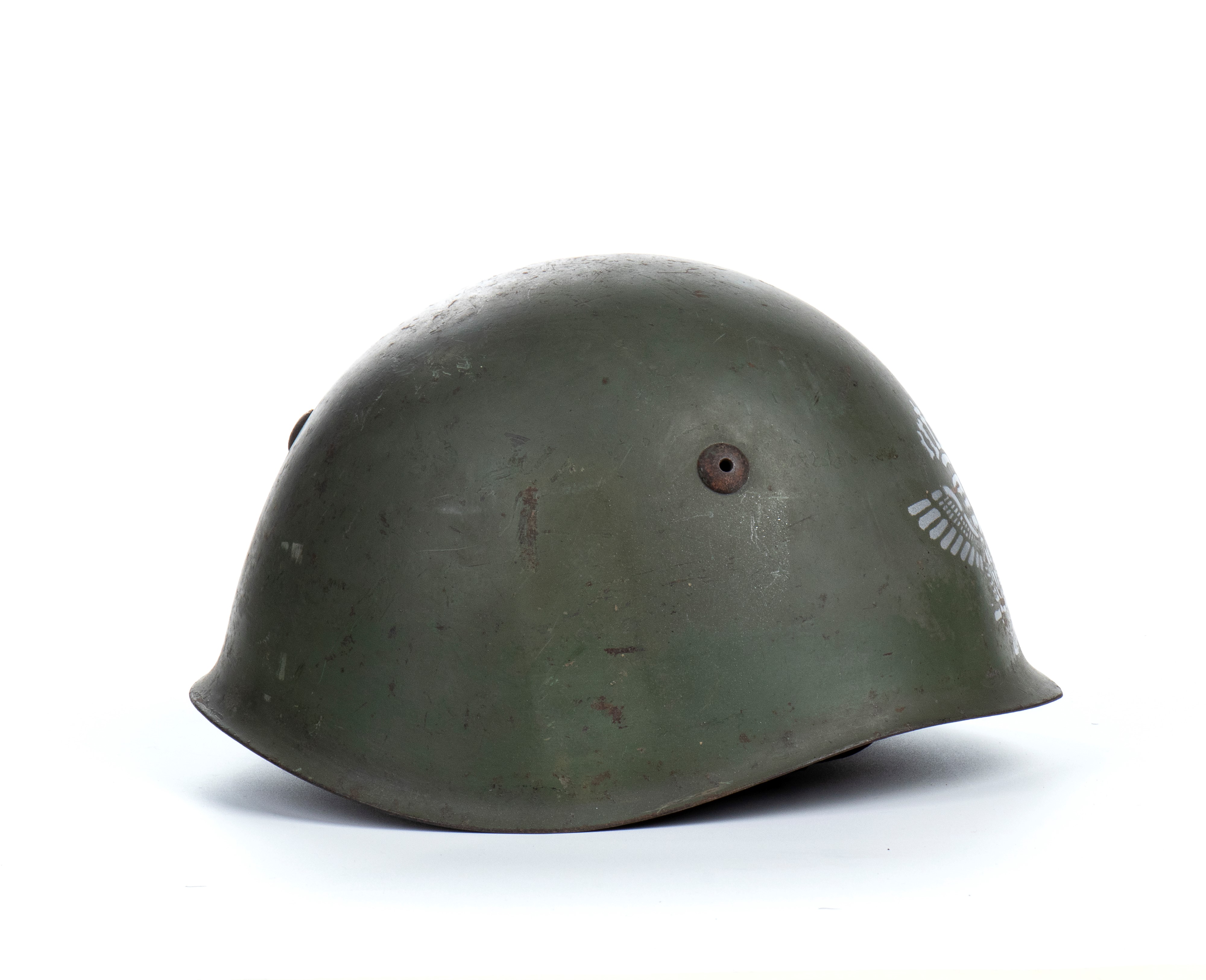 Light green ballistic steel helmet with first-type vents and a silver-painted front mask emblem; in good condition.