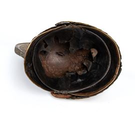Helmet with iron cup, fur-covered turban, large crest and brass chinstraps, toggle with monogram of the reigning sovereign, complete with interior, in good condition.