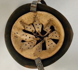 Marine helmet of the National Republican Navy, still front with crown removed and tricolour shield on the right side of the helmet, light leather interior, grey-green chin strap, in good condition