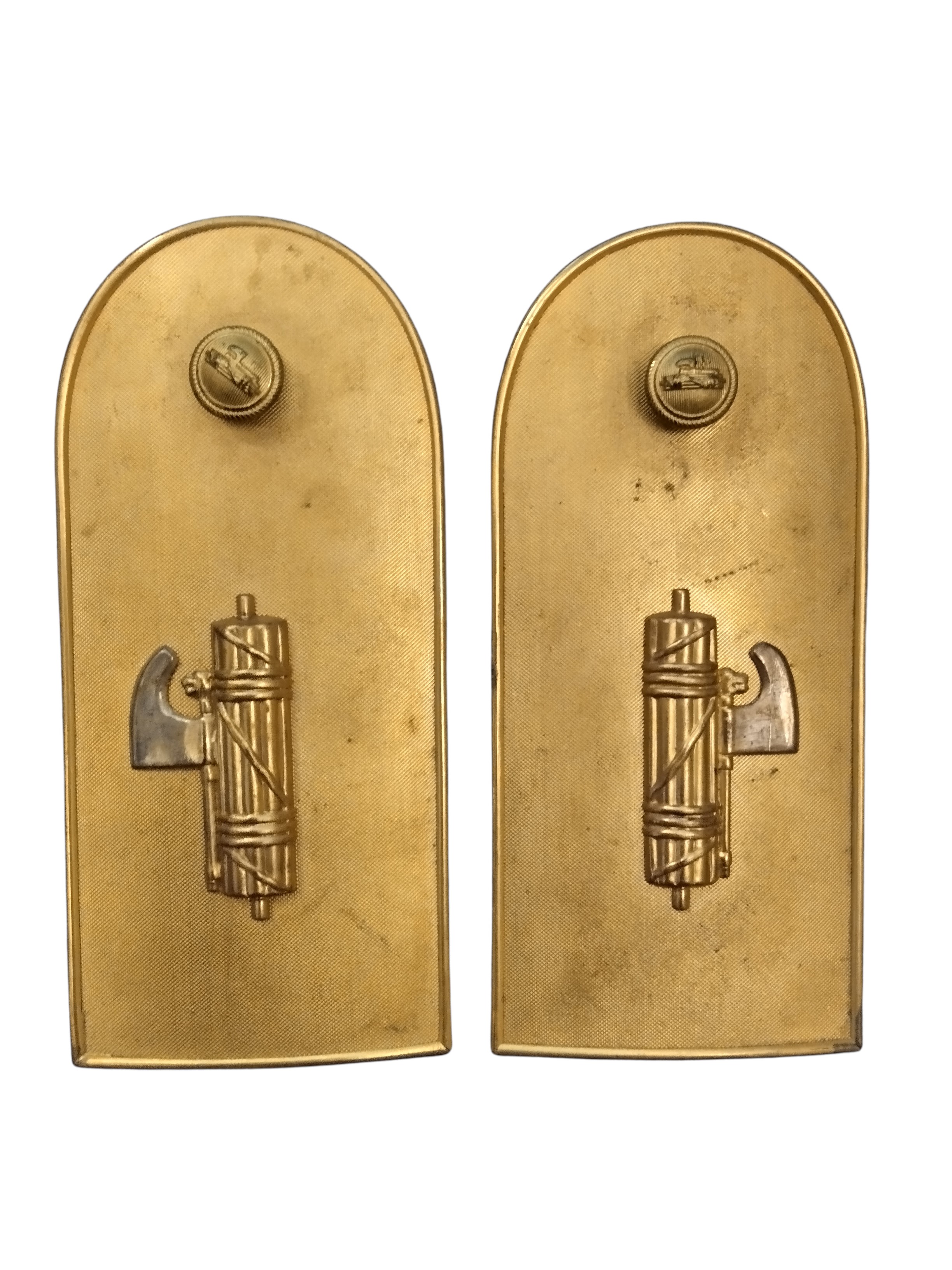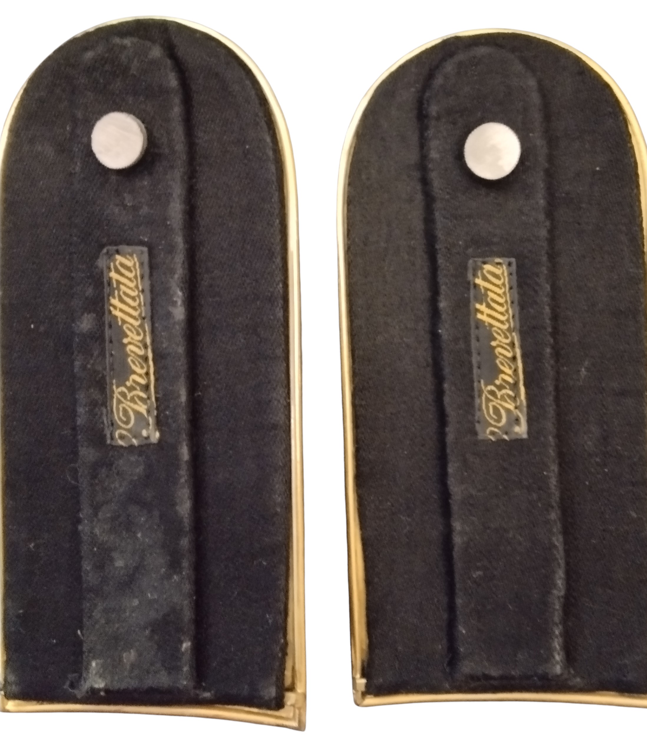 Metal shoulder boards for the dress uniform of a junior officer of the MVSN, stamped brass plate with applied metal fasces, black silk velvet lining, complete with screw buttons; in excellent condition.