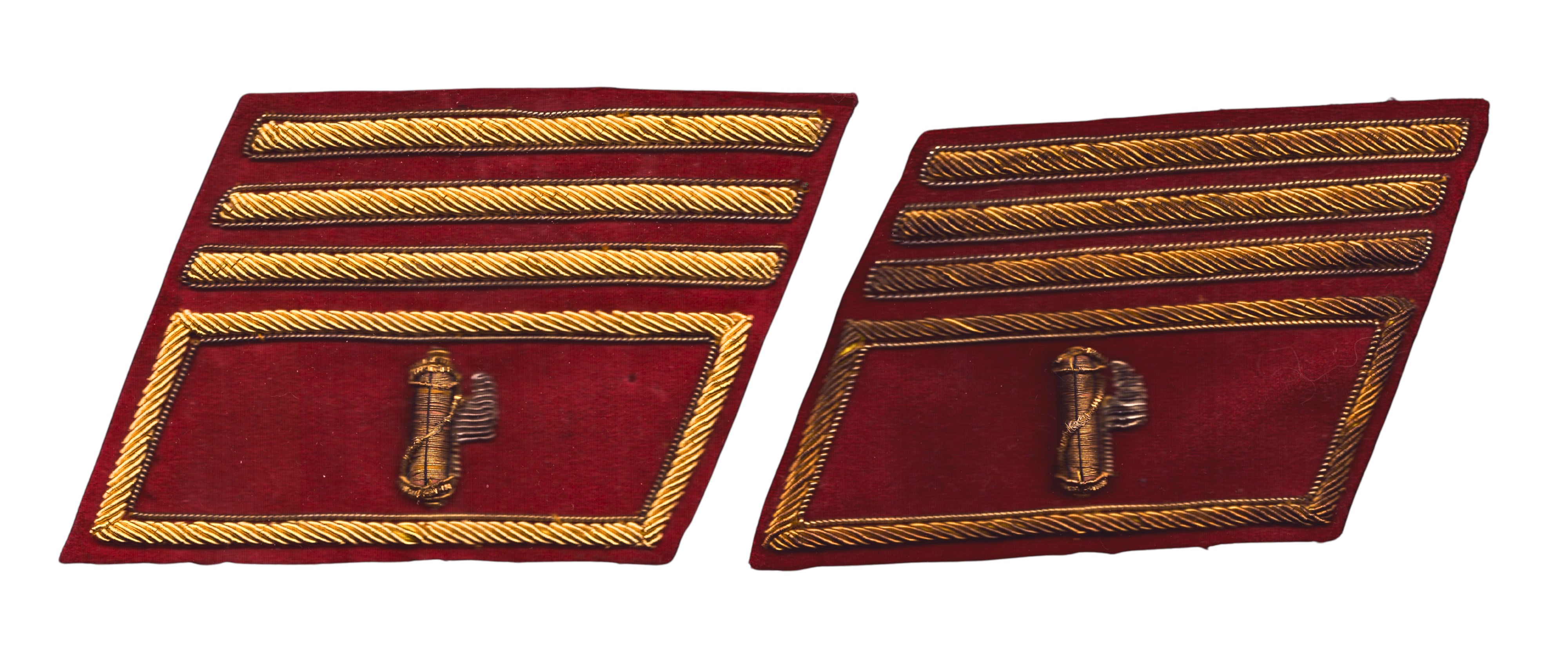 MVSN Commanding Consul, batch of two diamond-shaped ranks embroidered with gold wire on a mauve background, in excellent condition.