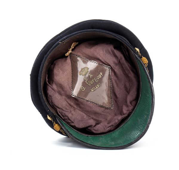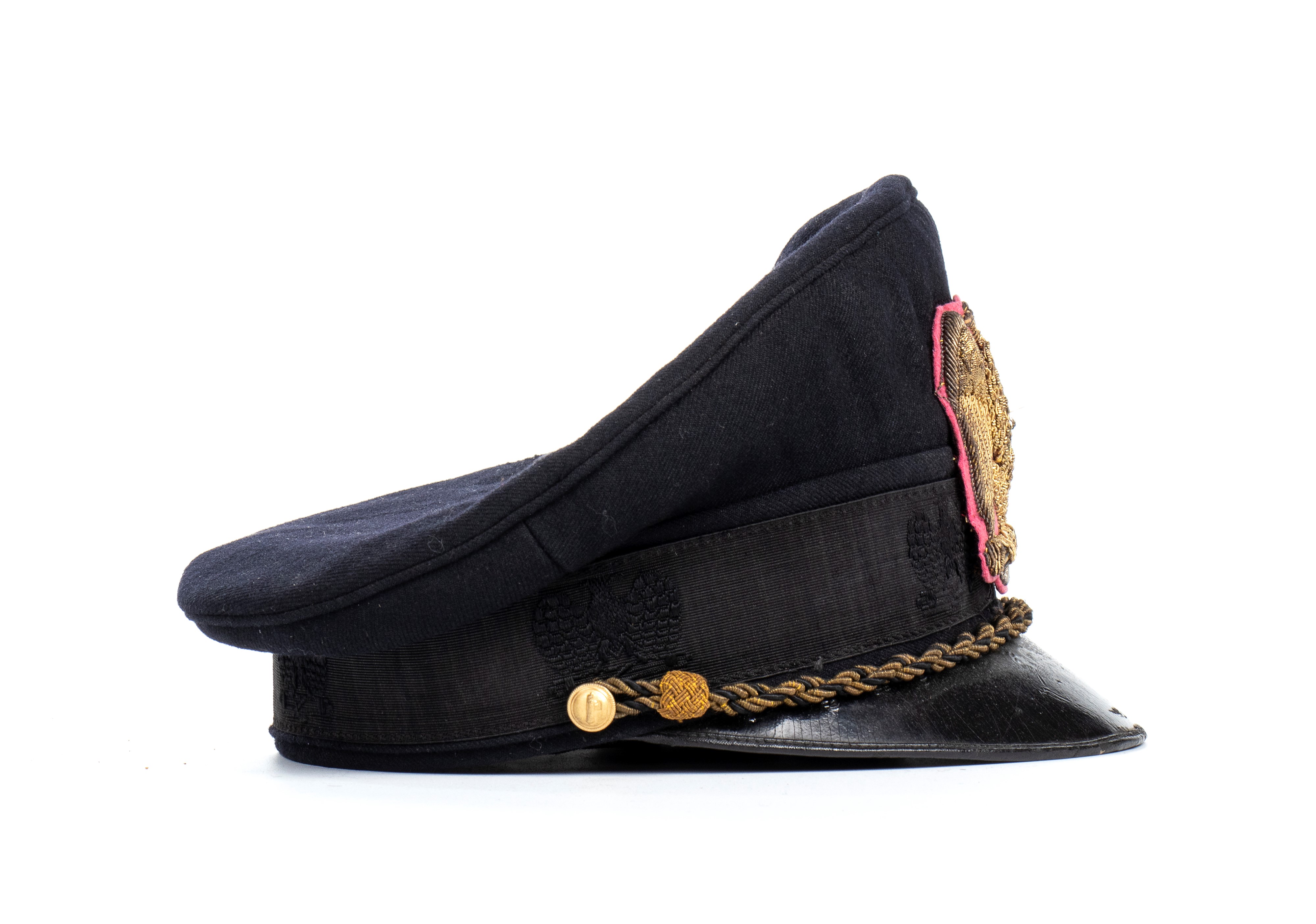 Splendid peaked cap for an official of the Ministry of Justice, made of dark blue gabardin with a damask band featuring imperial eagles, a beautiful frontal decoration of gold wire mesh on pink cloth, a gold/black mottled chin strap, gold buttons with fasces, in excellent condition.