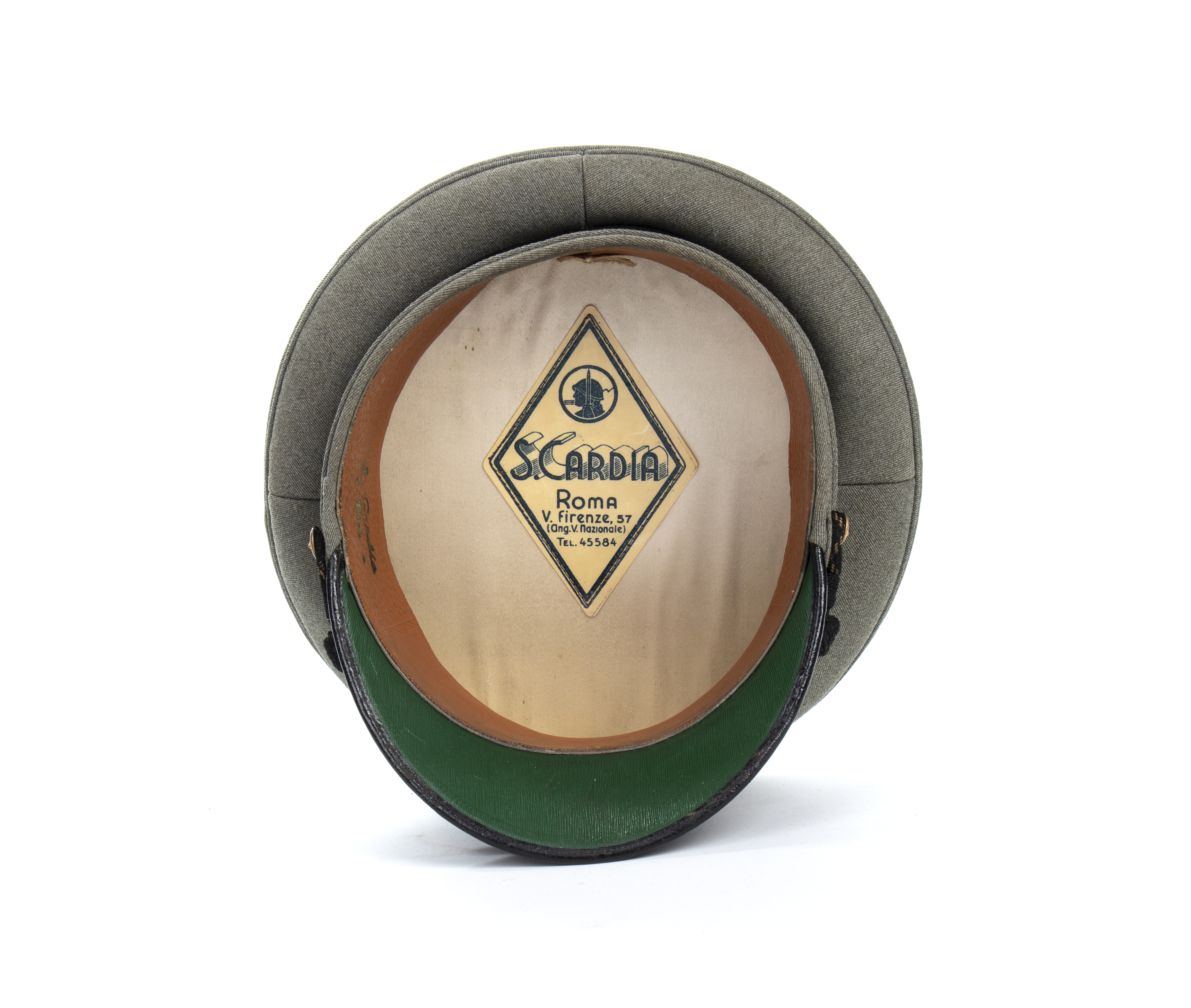 Beautiful grey-green gabardine cap with a damask band featuring fasces and foliage, a black eagle frontal badge with silver wire inserts, a black chin strap with silver streaks, and matching chin strap buttons, with fasces. Very beautiful and in excellent condition, rare as it was only used from 1942 until the armistice.