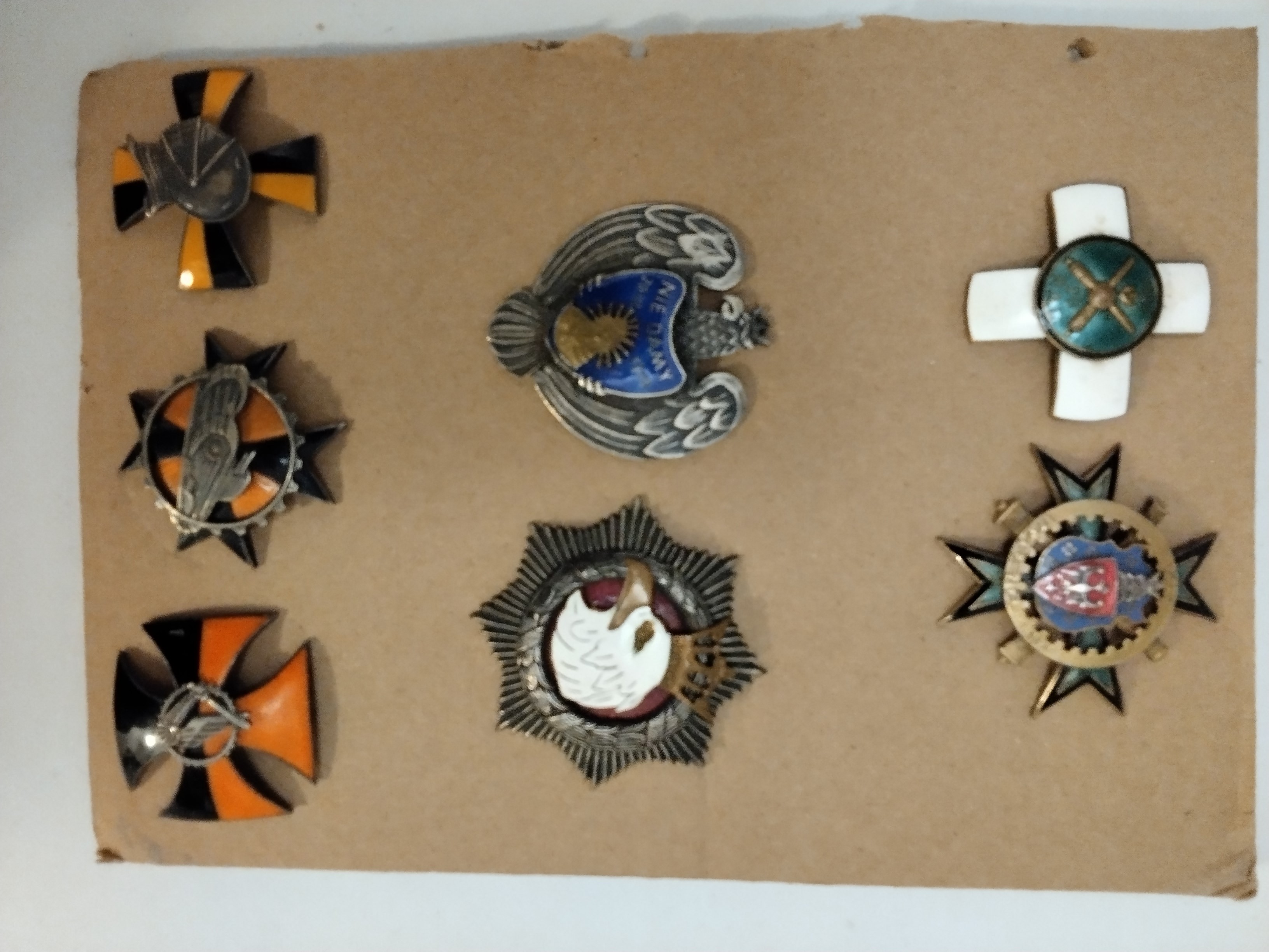 Poland, lot of seven regimental badges in silver-plated metal and polychrome enamel, mainly produced by the Panasiuk company of Warsaw., mid-20th century