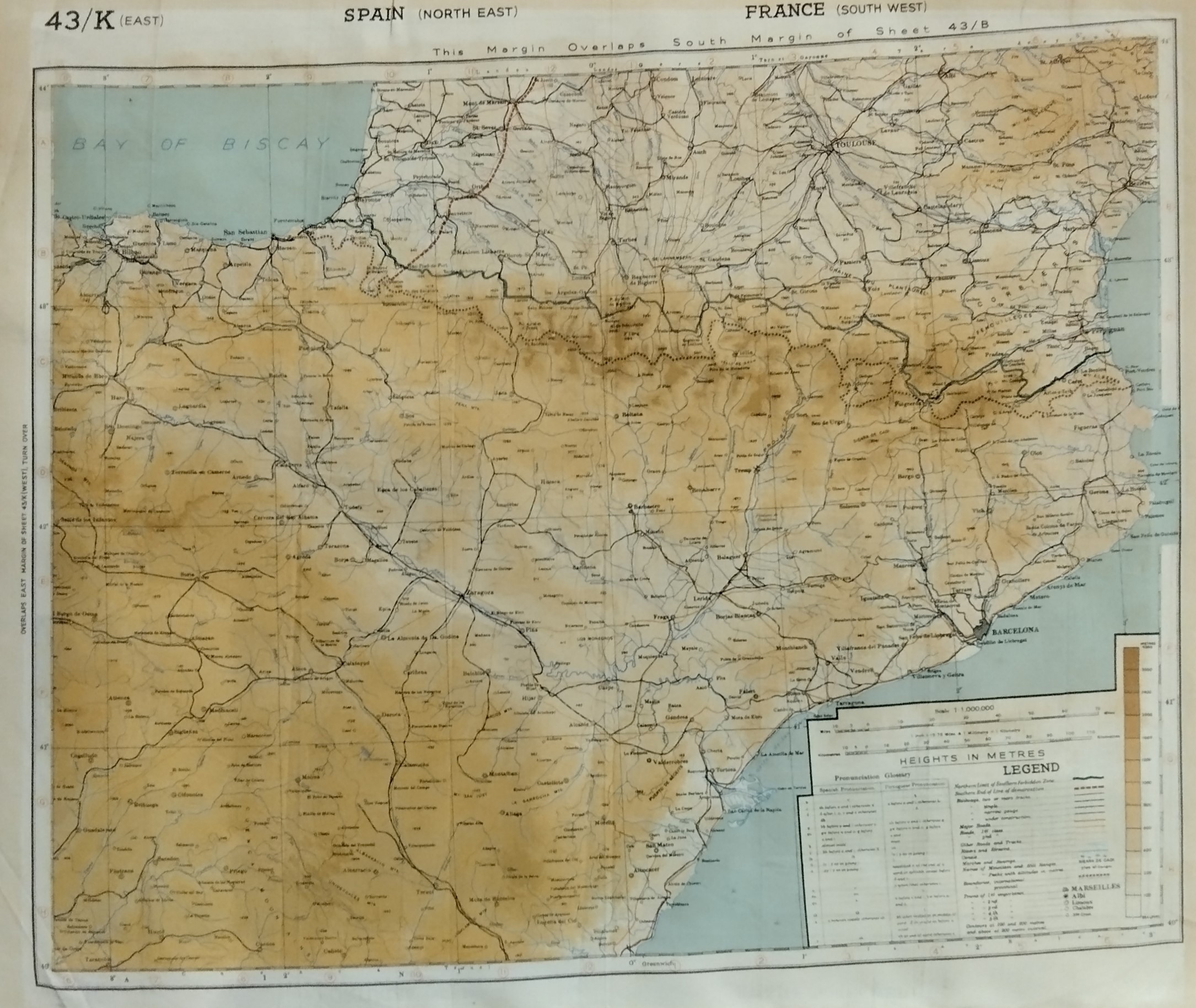 At a scale of 1:1,000,000, this is a characteristic topographic map used by RAF pilots who carried it inside their flight jackets. The map, in this case, depicts France, Spain, and Portugal.