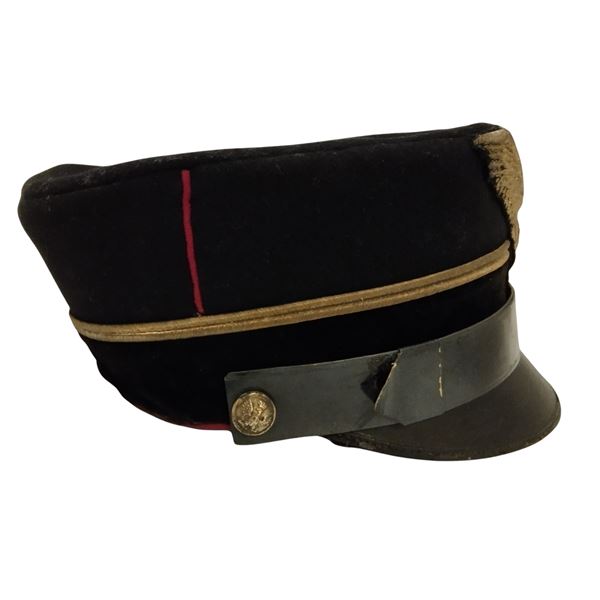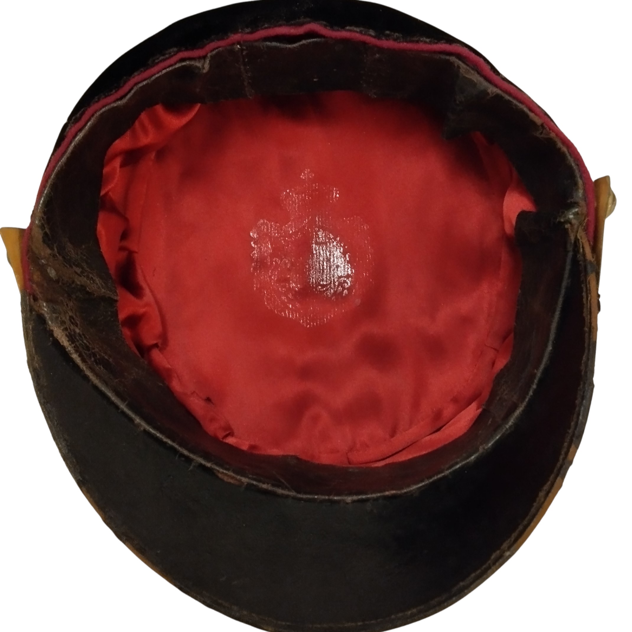 Royal Guard second lieutenant's cap, model 903, in dark blue cloth with crimson studs, beautiful silver-plated chain mail trophy, silk interior with manufacturer's marks, in good condition.