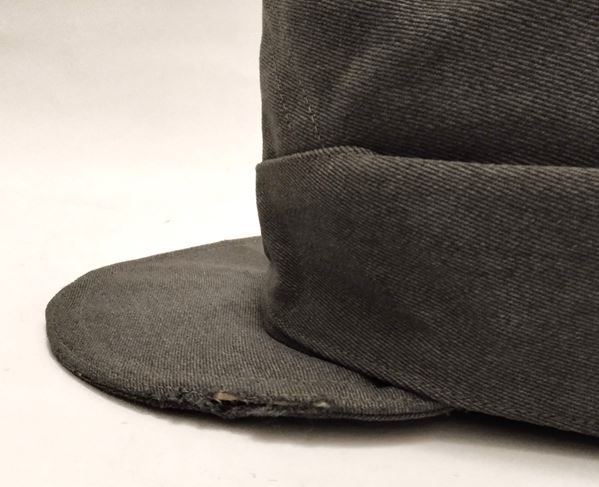In grey cord, front button in fibre with fake earflaps, interior in grey herringbone cotton satin, with front decoration in the shape of a skull embroidered in white cotton and eagle on the side, very rare, in good condition, in excellent condition, rare.