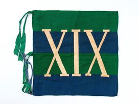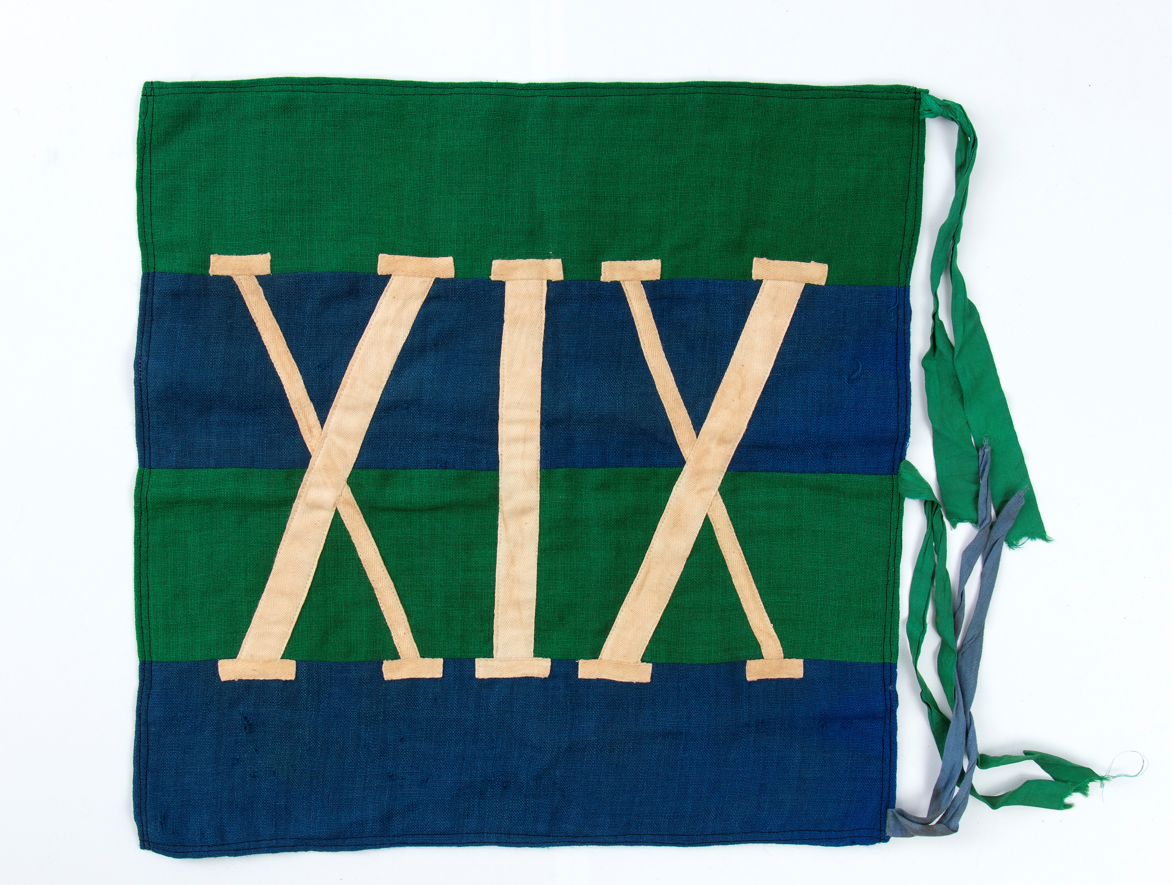 Made of rough fabric, probably linen, with four alternating green and blue horizontal sections. The numerals XIX are hand-stitched.