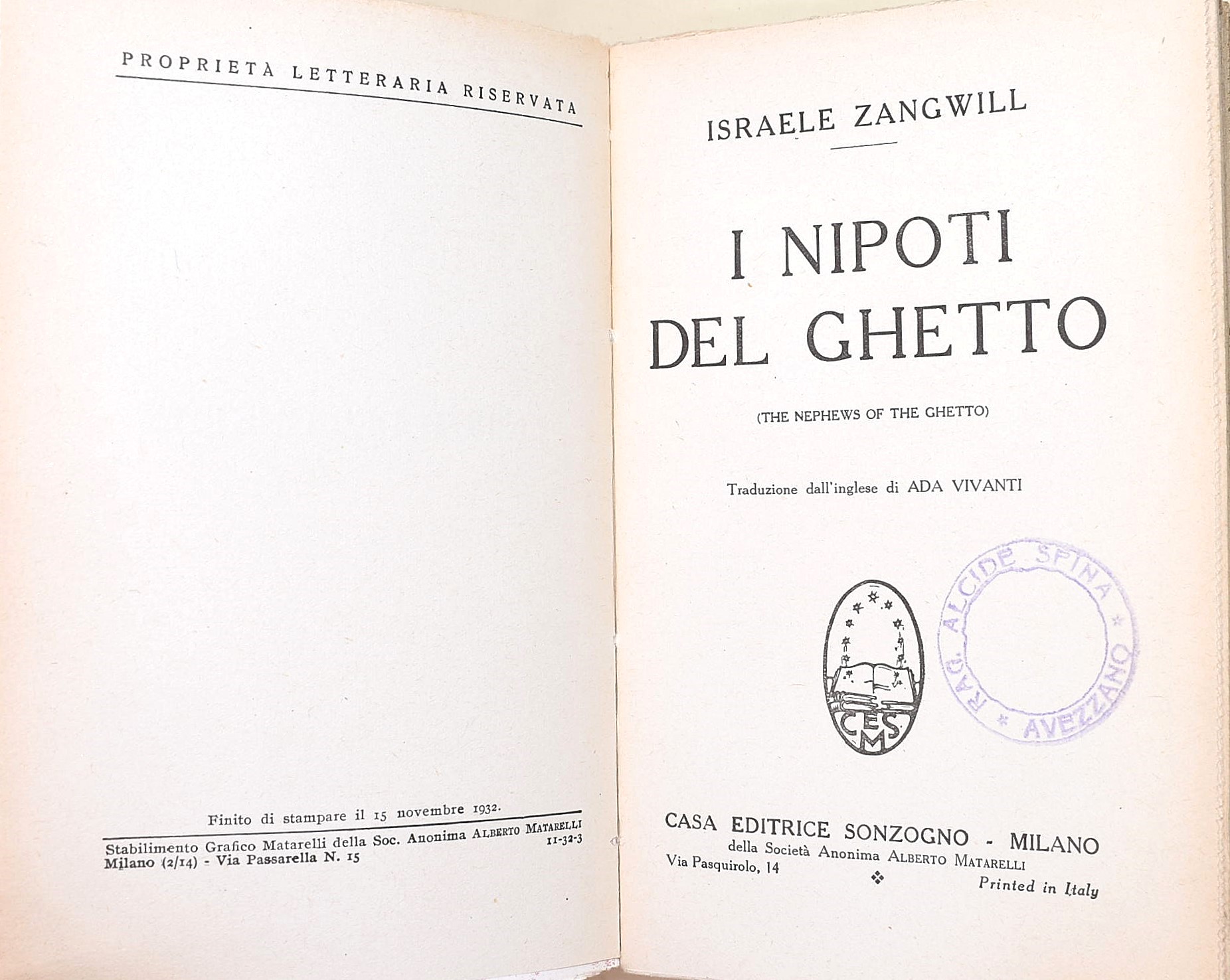 Zangwill, Israele: I nipoti del ghetto, Sonzogno, 1932. Brossura.