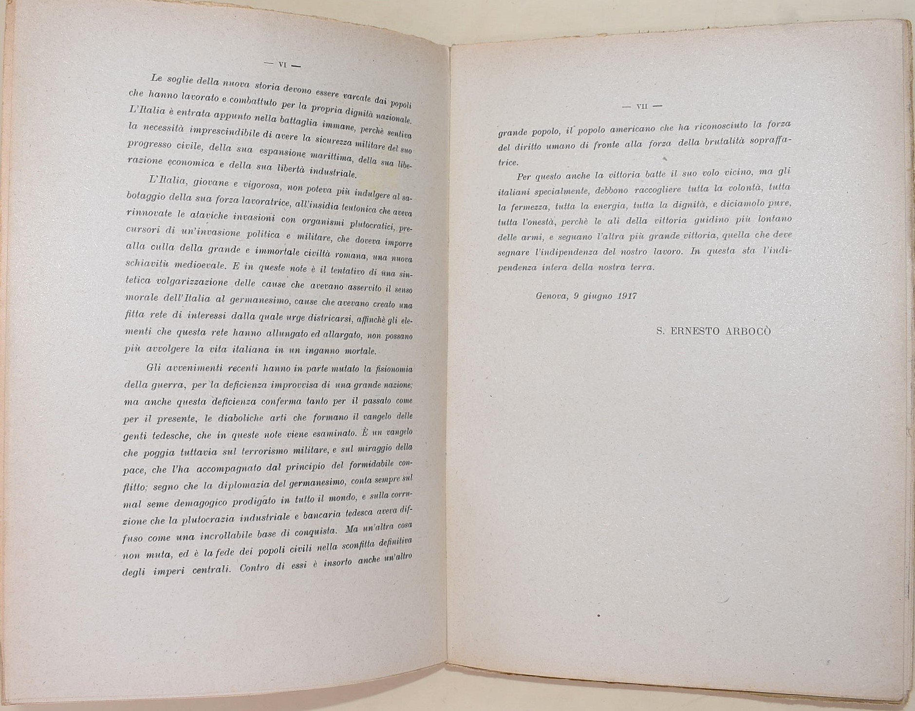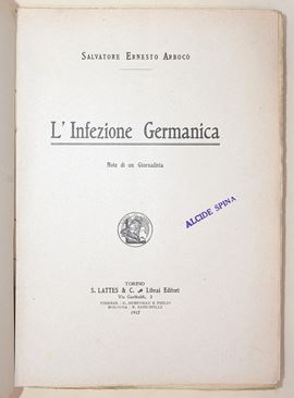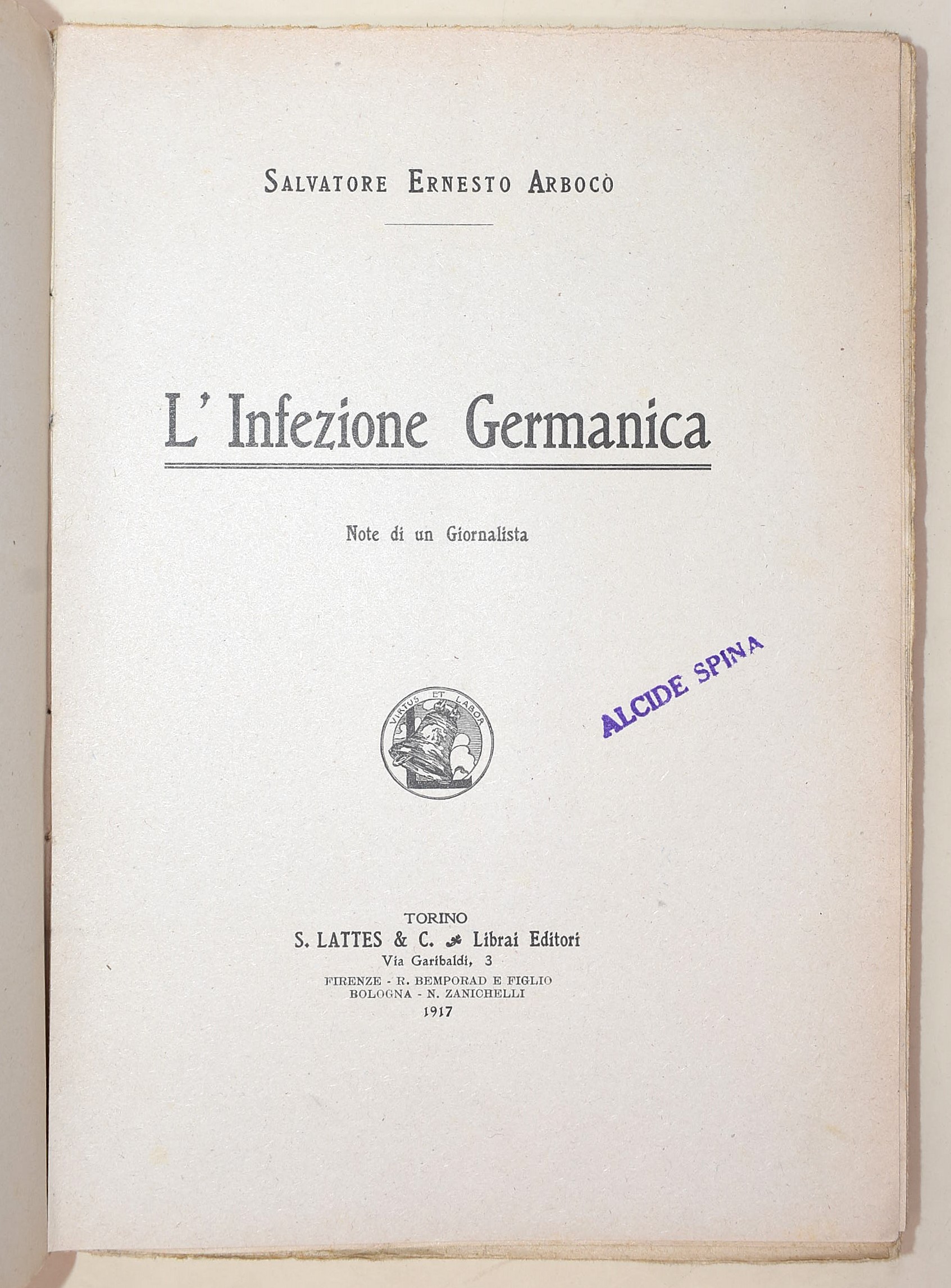 Arbocò, Salvatore Ernesto: L'Infezione Germanica. Note d'un giornalista, S. Lattes e C. Editori, 1917. Brossura.