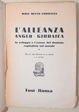 Wolf Meyer, Christian: L'alleanza anglo-giudaica. In sviluppo e l'azione del dominio capitalista sul mondo, Tosi, 1941 - XIX. Brossura. Occhiello strappato.