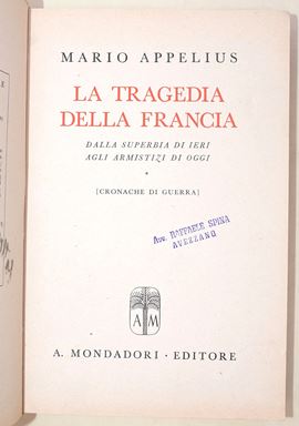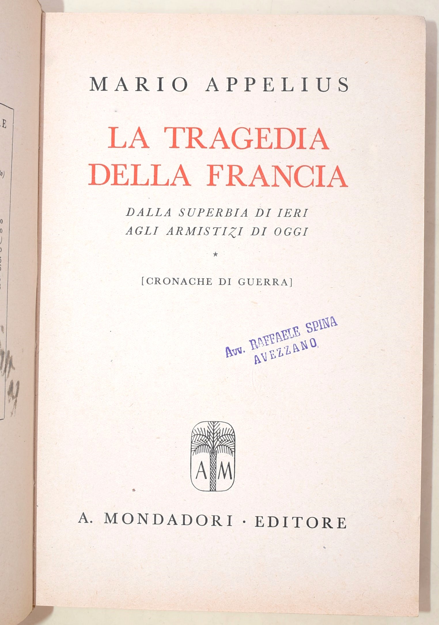La tragedia della Francia. Dalla superbia di ieri agli armistizi di oggi. Cronache di guerra di Mario Appelius, Mondadori, 1941. Brossura.