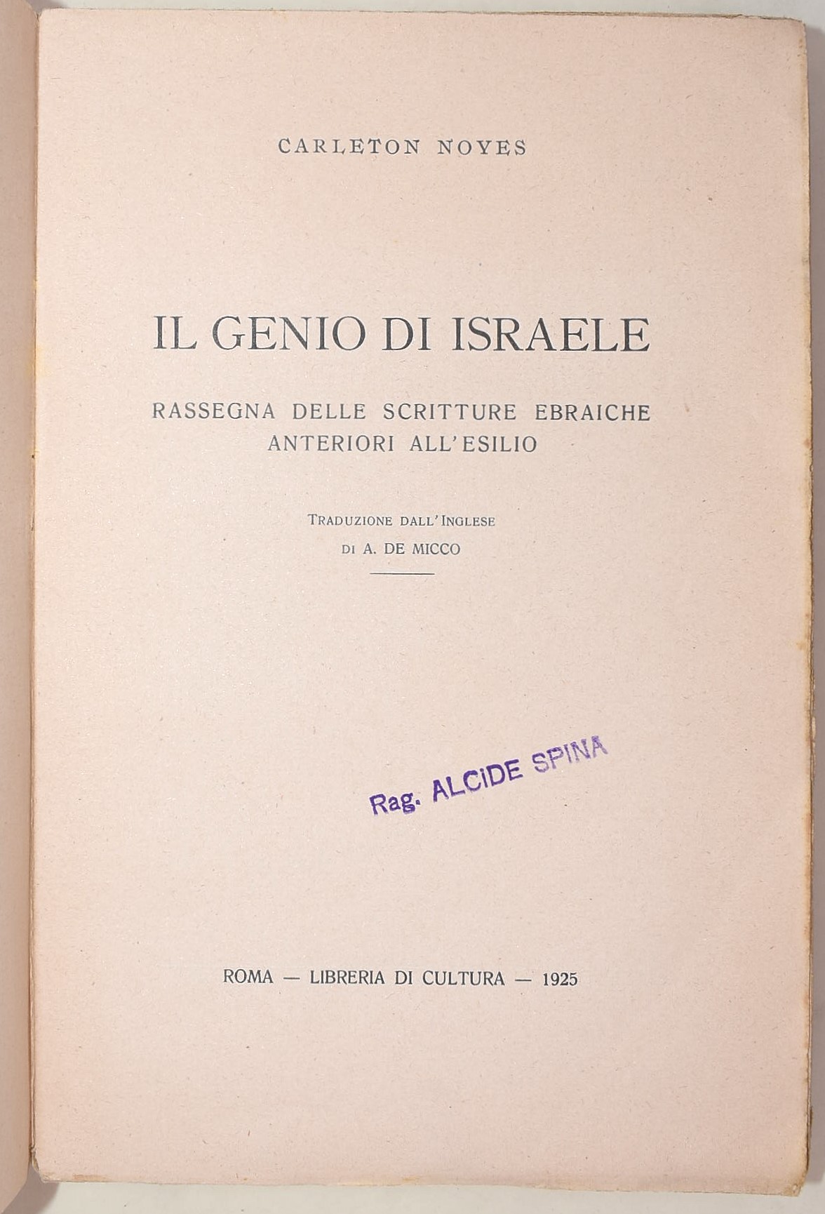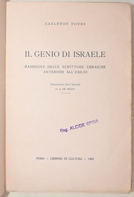 Noyes, Carleton: Il Genio d'Israele. Rassegna delle Scritture Ebraiche anteriori all'esilio, Libreria di Cultura, 1926. Brossura.