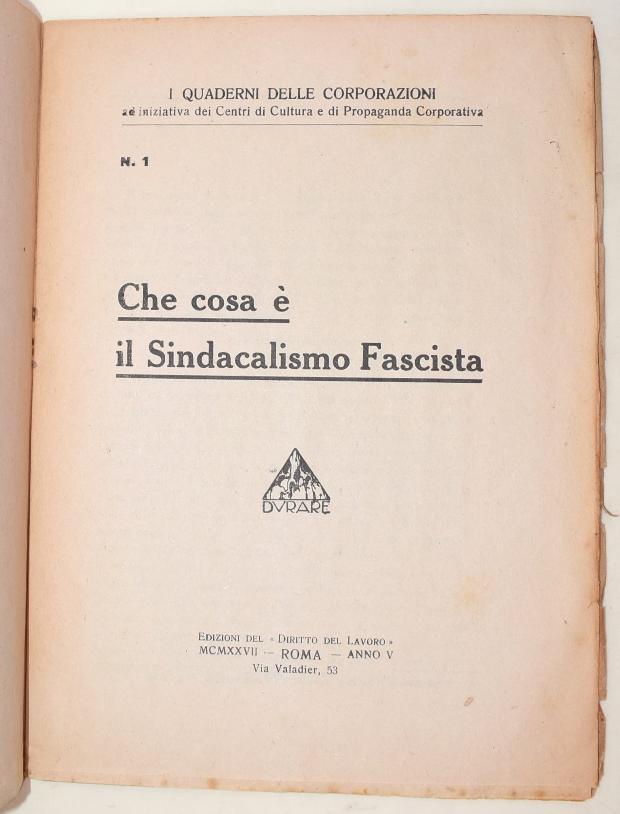 I Quaderni delle Corporazioni. Che Cosa è il Sindacalismo Fascista, N. 1, Edizioni del "Diritto del Lavoro", 1927. Opuscolo.