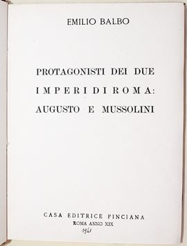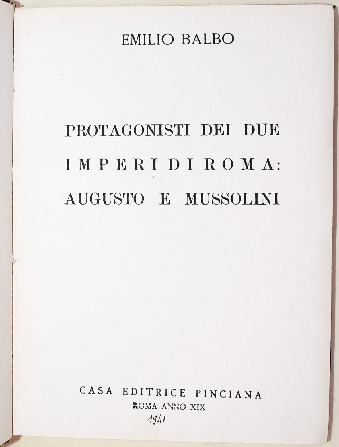 Augusto e Mussolini di Emilio Balbo, Pinciana, 1941-XIX. Legatura in piena tela.