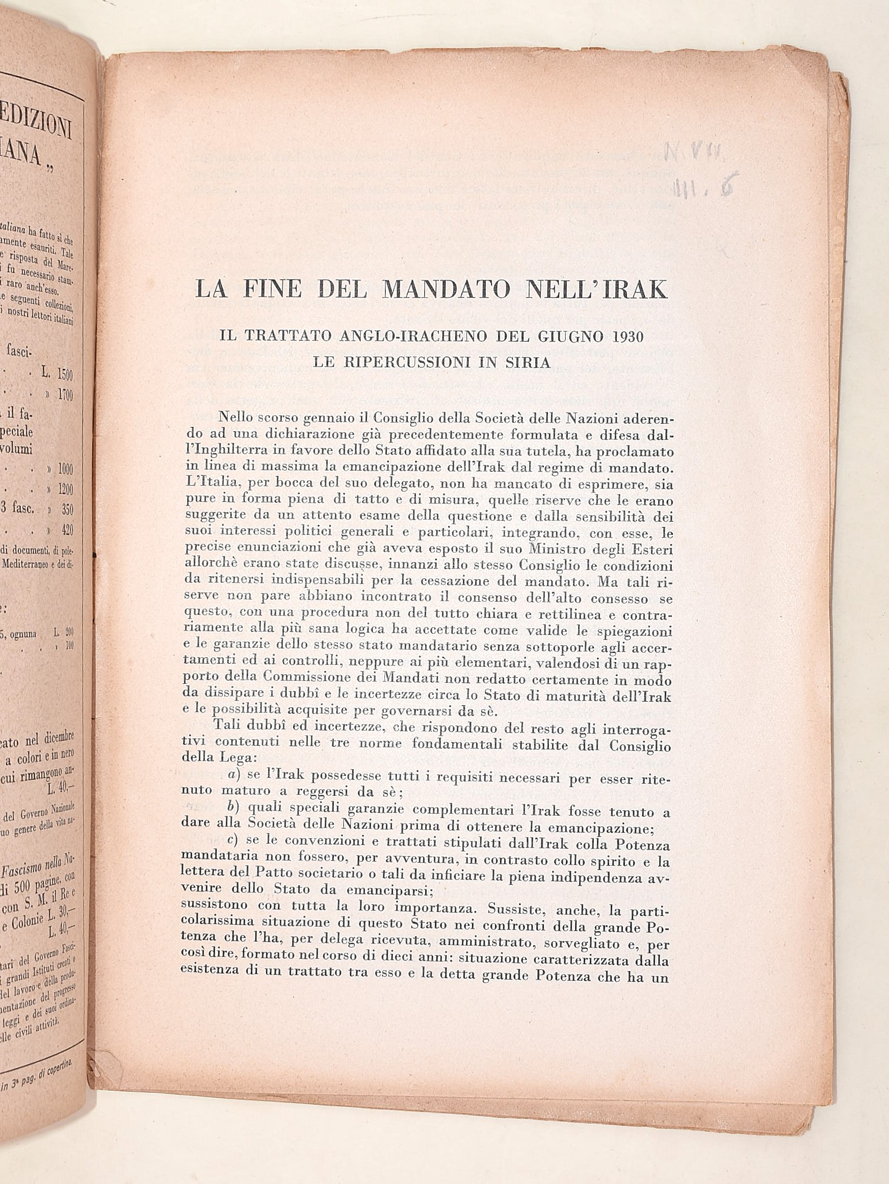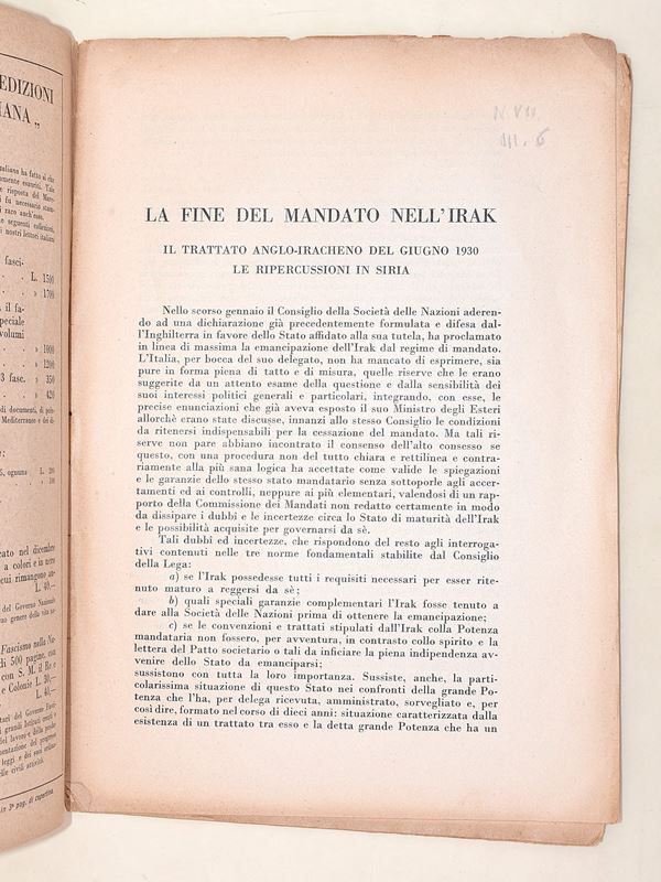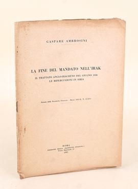 Ambrosini, Gaspare: La fine del mandato nell'Irak. Il trattato anglo-iracheno del giugno 1930. Le ripercussioni in Siria. Estratto dalla Rassegna Italiana - Marzo 1932-X. CLXVI. Opuscolo.