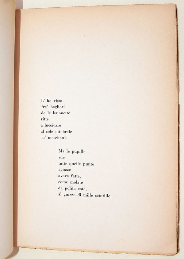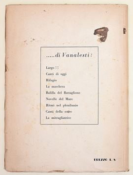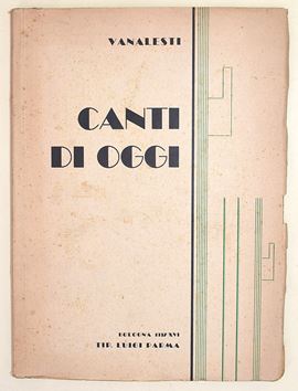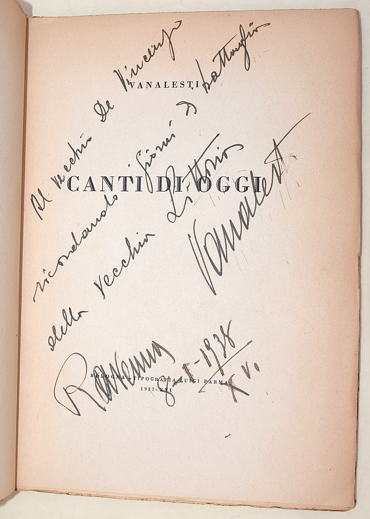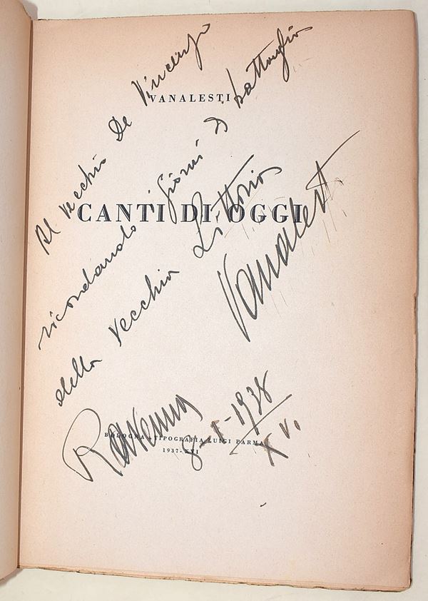 Vanalesti: Canti di Oggi, Tip. Luigi Parma, 1937-XVI. Sentita dedica autografa dell'autore: "Al vecchio De Vincenzo ricordando giorni di battaglia della vecchia littoria. Vanalesti Ravenna 8-1-1938-XVI". Fascio littorio stilizzato in copertina.