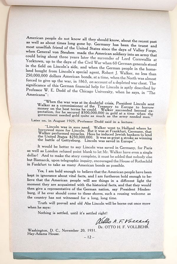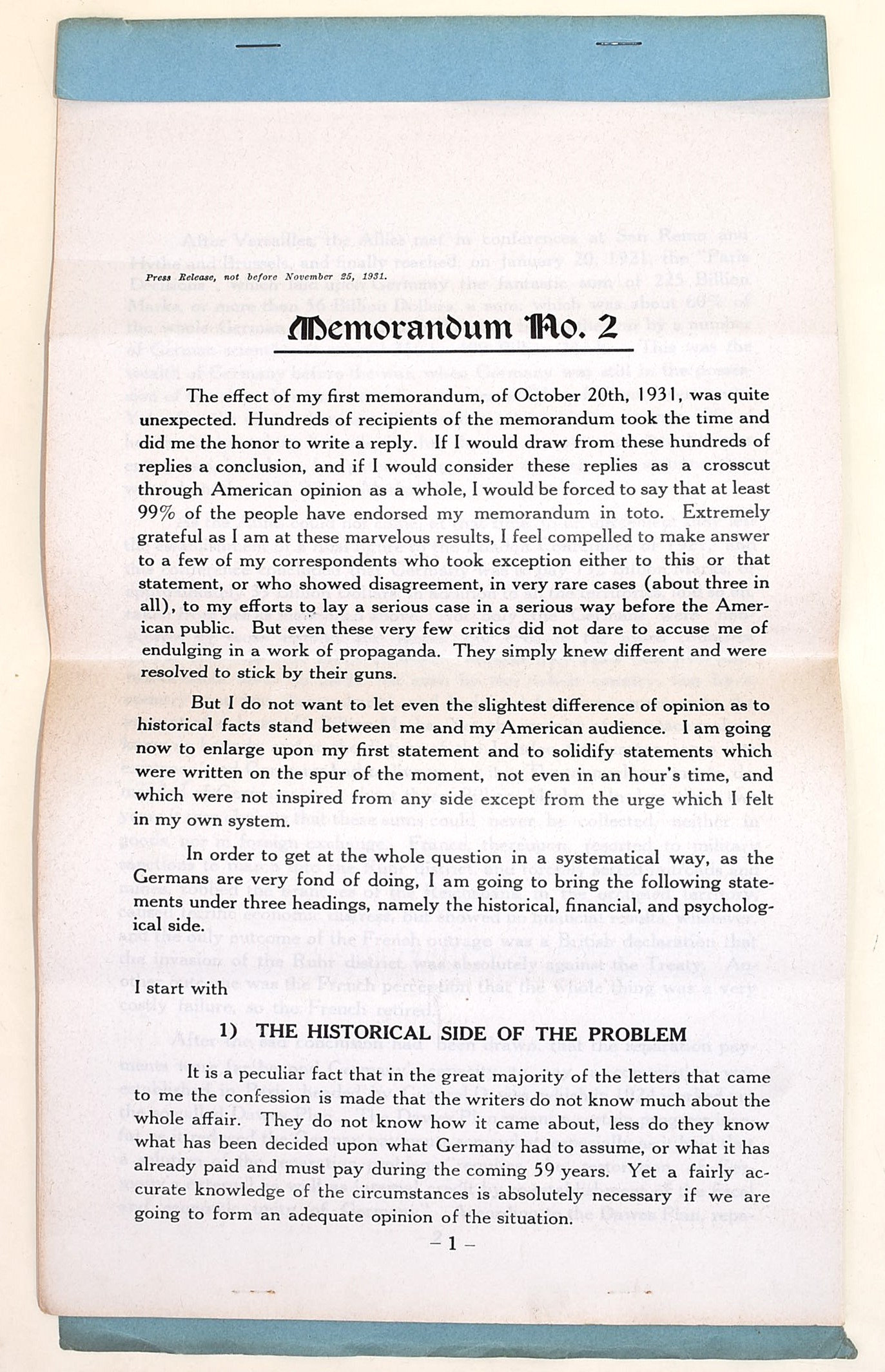 Documenti segreti propaganda nazista tradotti in inglese rilasciati non prima del 25 novembre 1931 dal titolo "Memorandum No. 2". 12 pagine. Al fine firmato da dr. Otto H. F. Vollbehr.