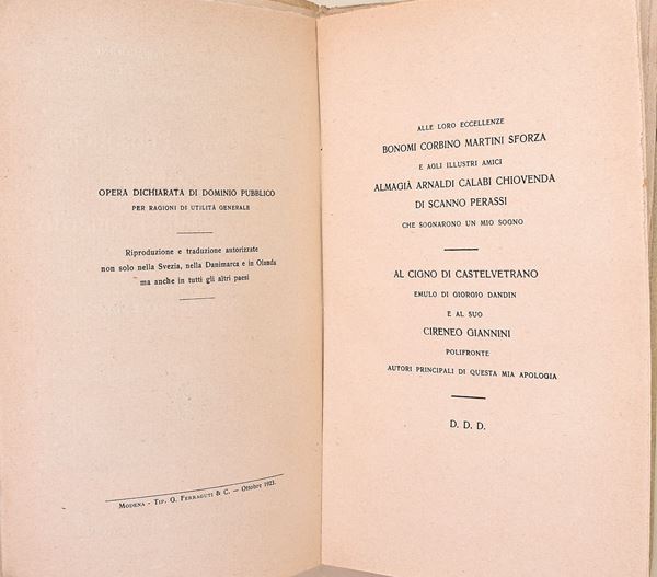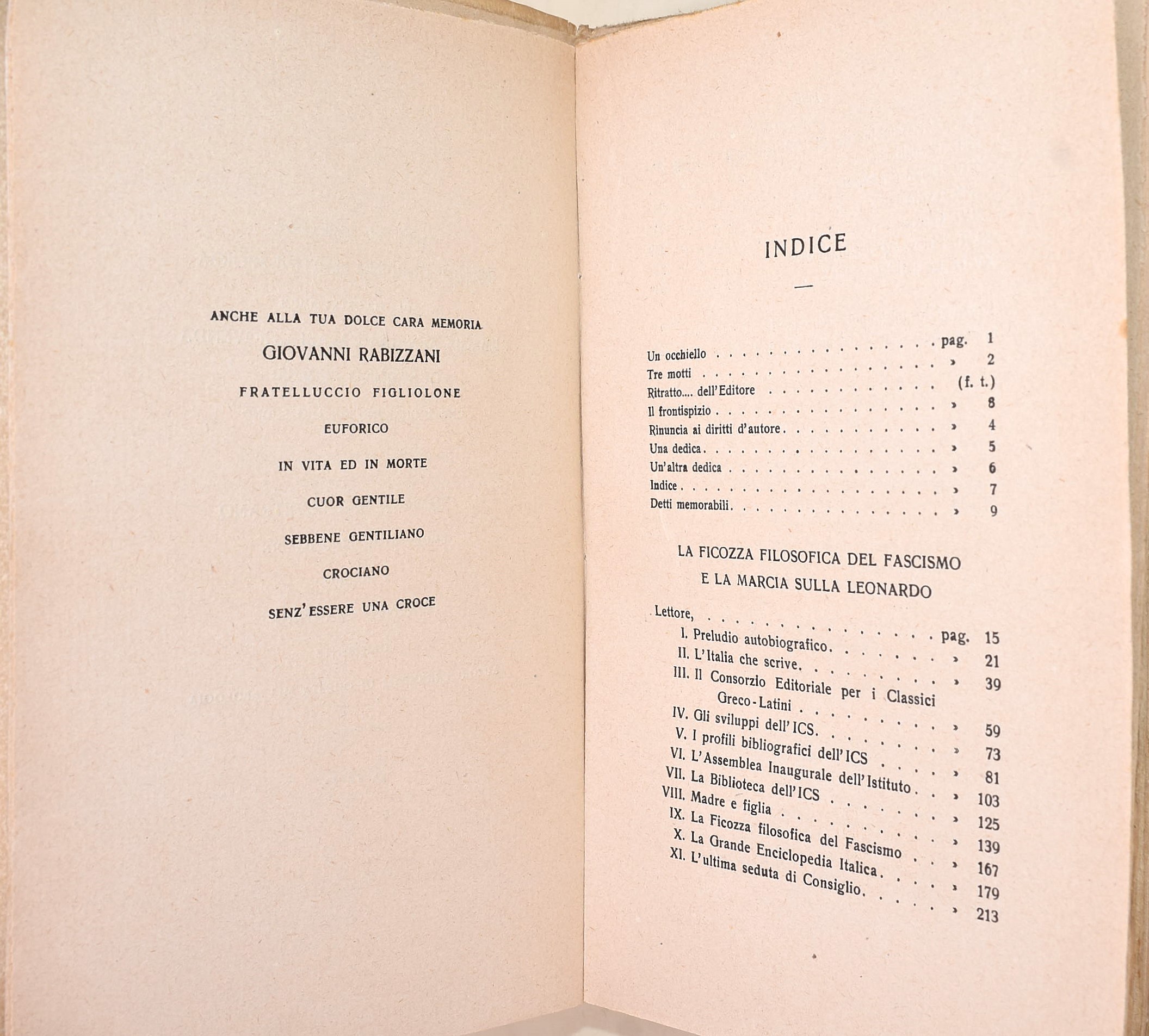 Formiggini, A. F.: La Ficozza Filosofica del Fascismo e la Marcia sulla Leonardo, A. F. Formaggini Editore, 1923.