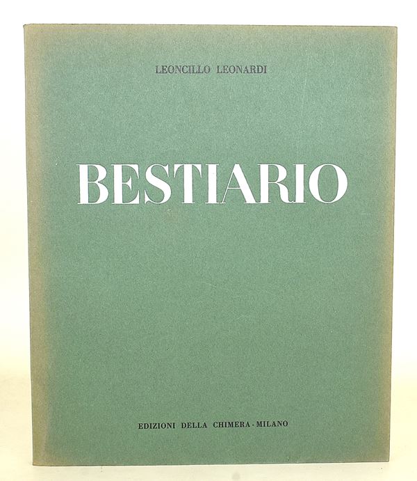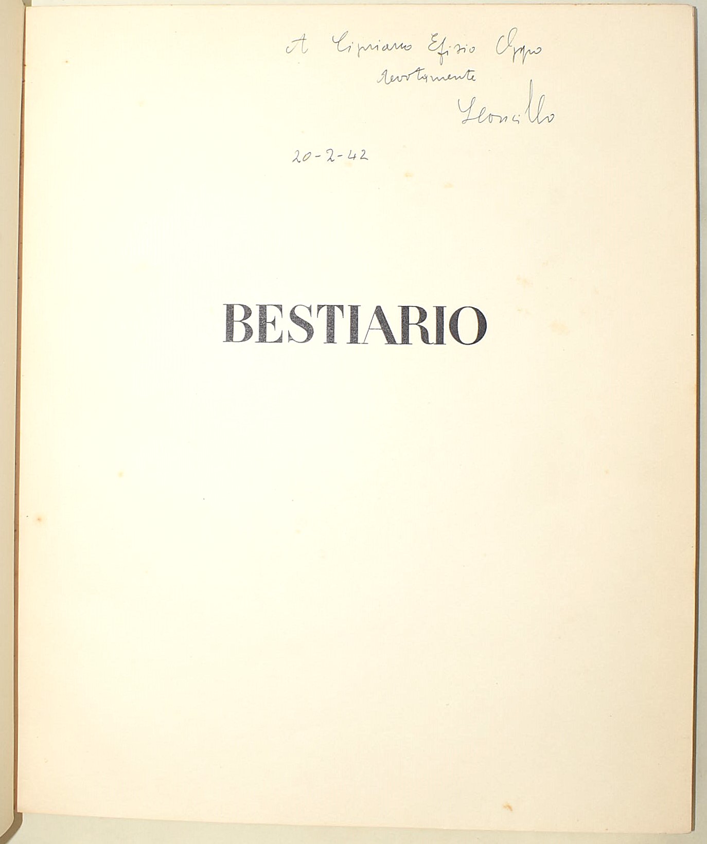 Leoncillo, Leonardo: Bestiario, Edizioni della Chimera, 1941. Legatura editoriale in tela con copertina della brossura editoriale conservata. Volume in 4Β°. 20 litografie originali protette da veline, 3 delle quali colorate a "pochoir", tutte firmate a lapis da Clerici.  Esemplare appartenuto a Cipriano Efisio Oppo con dedica autografa e firmata da Leoncillo con rinvio al possessore nell'occhiello. Uno dei 15 esemplari fuori commercio.