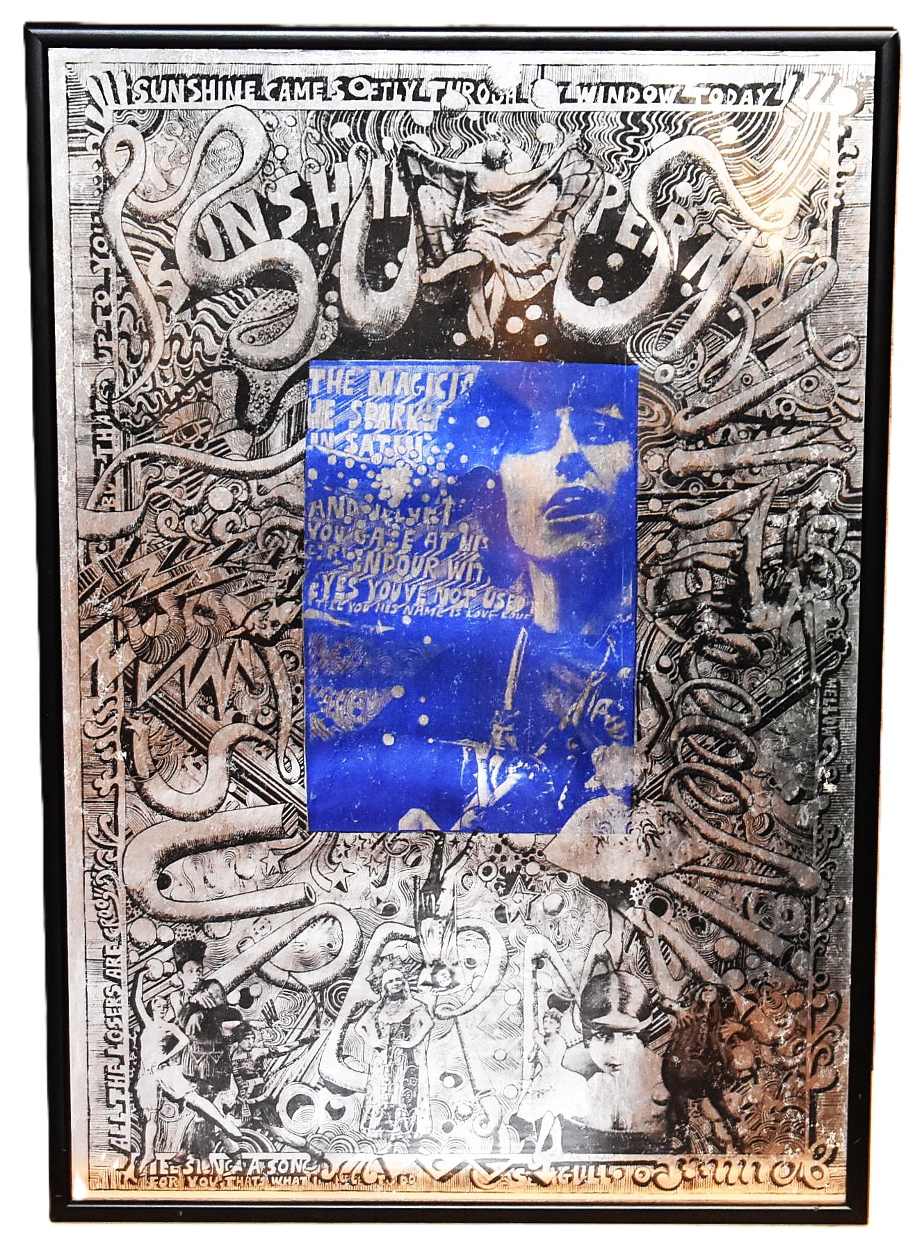 Poster psichdelico originale eseguito dall'Artista Australiano Martin Sharp. Stampato in nero e blue su carta metalliazata color argento. In cornice di legno nero laccato 79x54 cm.