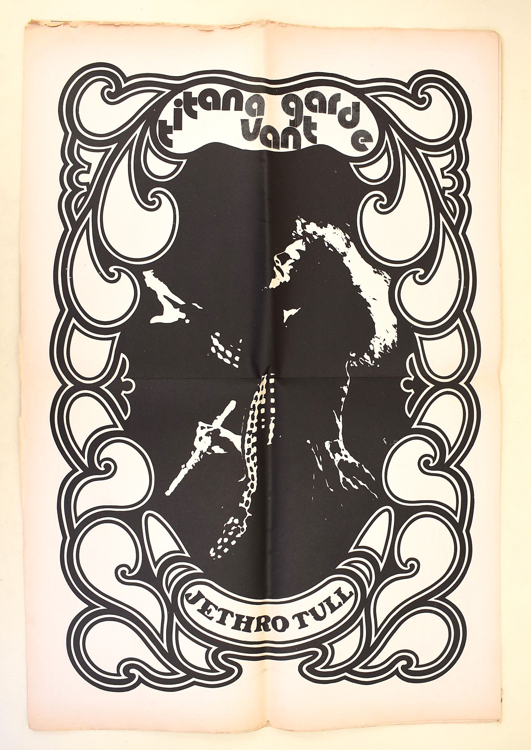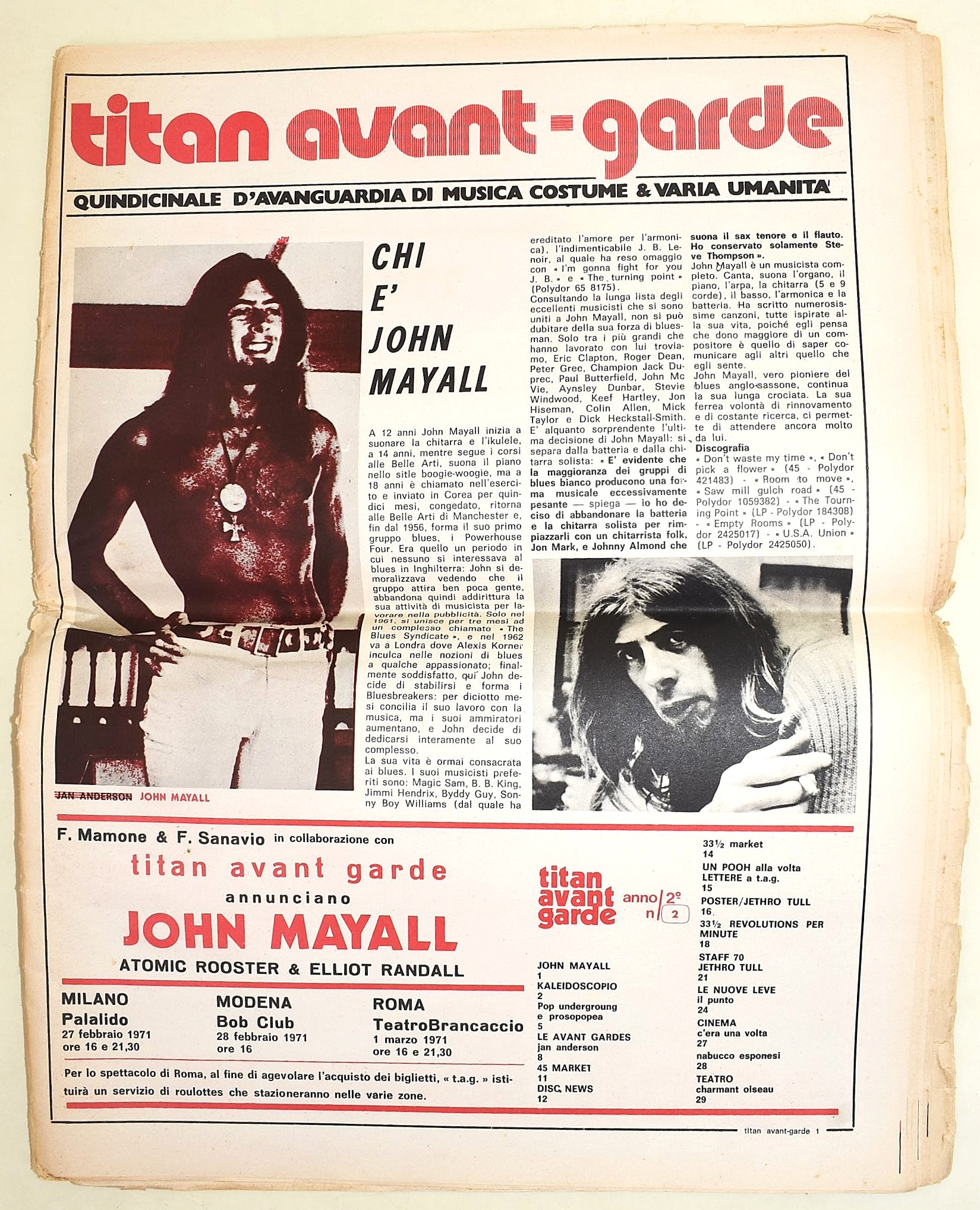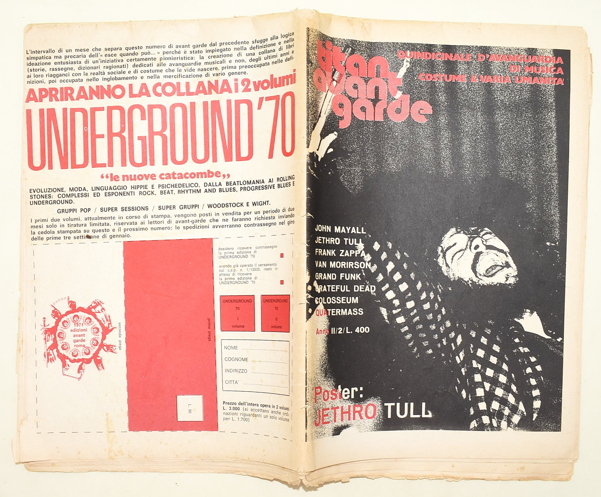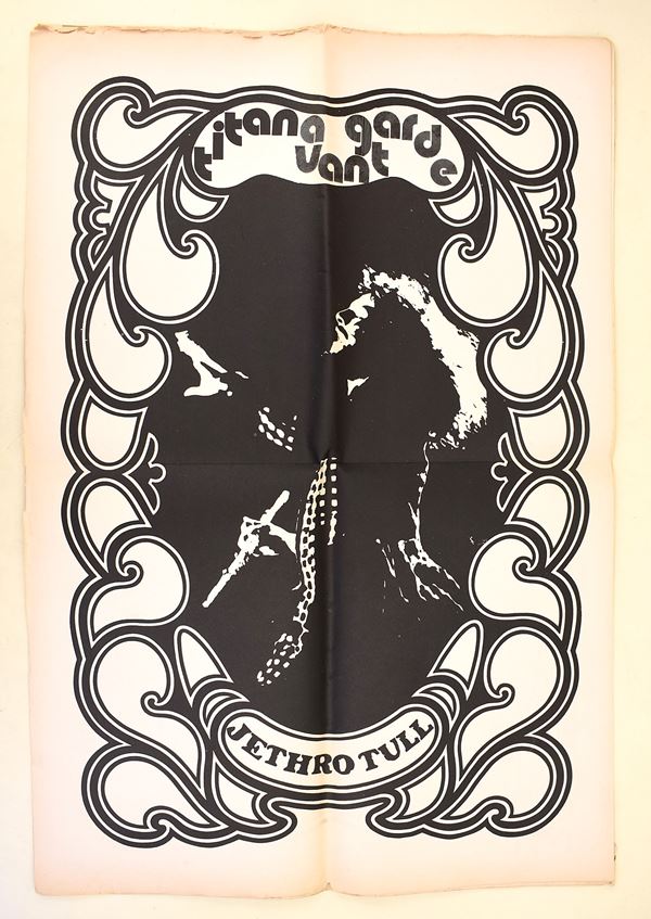 Titan Avant-Garde. Quindicinnale d'Avanguardia di musica di costume & varia umanità. Anno II/ 2 (1971). John Mayall, Jethro Tull, Frank Zappa, Van Morrison, Grand Funk, Grateful Dead, Colossesum e Quitermass. Rivista diretta da Renato Mariotti. Lievi difetti. Rivista originale del 1971. 32 pagine stampate in nero e a colori. Grande poster a doppia pagina al centro della rivista raffigurante Jethro Tull. Dimensioni: 43x32 cm ca. Si presenta ripiegata in 2 con doppie copertine. Piccoli fori nella parte della piegatura.